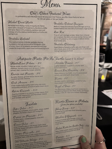 Everything was on point, from the fresh-baked rustic bread and focaccia with pesto and tapenade, to the three antipasti, the mains, and dessert. We were driving back on a rainy night so decided not to have wine, but one of our party had a cocktail and loved it. The support staff were on top of water refills, silverware, etc. Perfectly seamless service.
