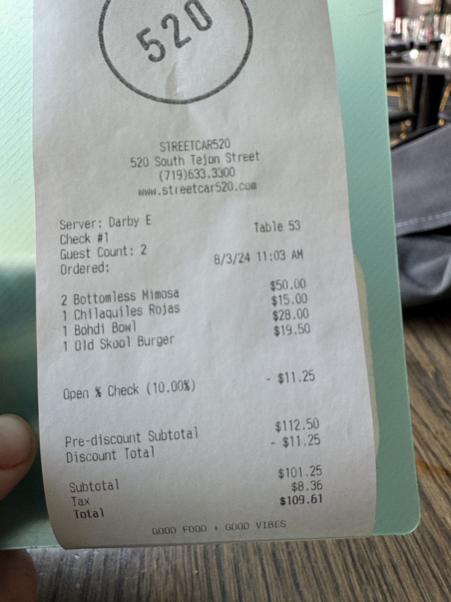 Read moreTerrible place. Awful experience!!!! Last week while visiting Colorado, my wife and I found this place on Google. After searching and reading the reviews, we decided to go there with friends. We sat down outside and ordered appetizers and drinks to start and looked forward to a nice meal, in a nice place, after a long day of travel. The appetizers and drinks were good and we placed our entrĂŠe order. After a short while, a bee landed in my wifeâs Cosmo. The waitress was busy and I decided to bring it to the bartender to see if we could get a new one. It was about 1/2 -way full. When I showed it to the bartender, he looked at me and asked, âso what do you want me to do about it?â I felt awkward and responded that it would be nice if he replaced it because of the bee inside the drink. With a look as though I was trying to rob him, he responded, âyou want me to replace your drink?â I replied that he should do what he feels is right, left the drink, and returned to our table. The waitress returned shortly, placed a ½-filled drink in front of my wife and saidâ hereâs your ½ Cosmoâ. We were all surprised by the attitude and wondered what to do next. We had too much fun on too long of a day to get truly upset. I then looked at the glass and noticed, it looked the same as the one I returnedâŚWITHOUT THE BEE! Seeing my wife NOT happy about this, I had had enough with this absolute insult! I took the drink back. Placed it in front of the wise-guy bartender and let him know how insulted I was. I then cancel the entrees and asked for the check. When it came, she said she would email it to me. I asked for a paper copy. The waitress seemed disturbed by the request and sent someone else with it. I paid the bill without a tip. Here is my tipâŚDO NOT GO TO STREETCAR 520! BTW: According to their attitudes, they now owe me for the ½-drink we never finished. Donât worry I wonât ever be going back! If this is what they do when a customer is looking, imagine what they do when no one is looking!!! We made up for the upsetting time by having a fantastic dinner at Spring Orleans and the most incredible dessert at The Famous Steak House. We visit often. We may keep learning which are the nice places to go to, but we definitely know not to go to this Streetcar 520. Itâs a...