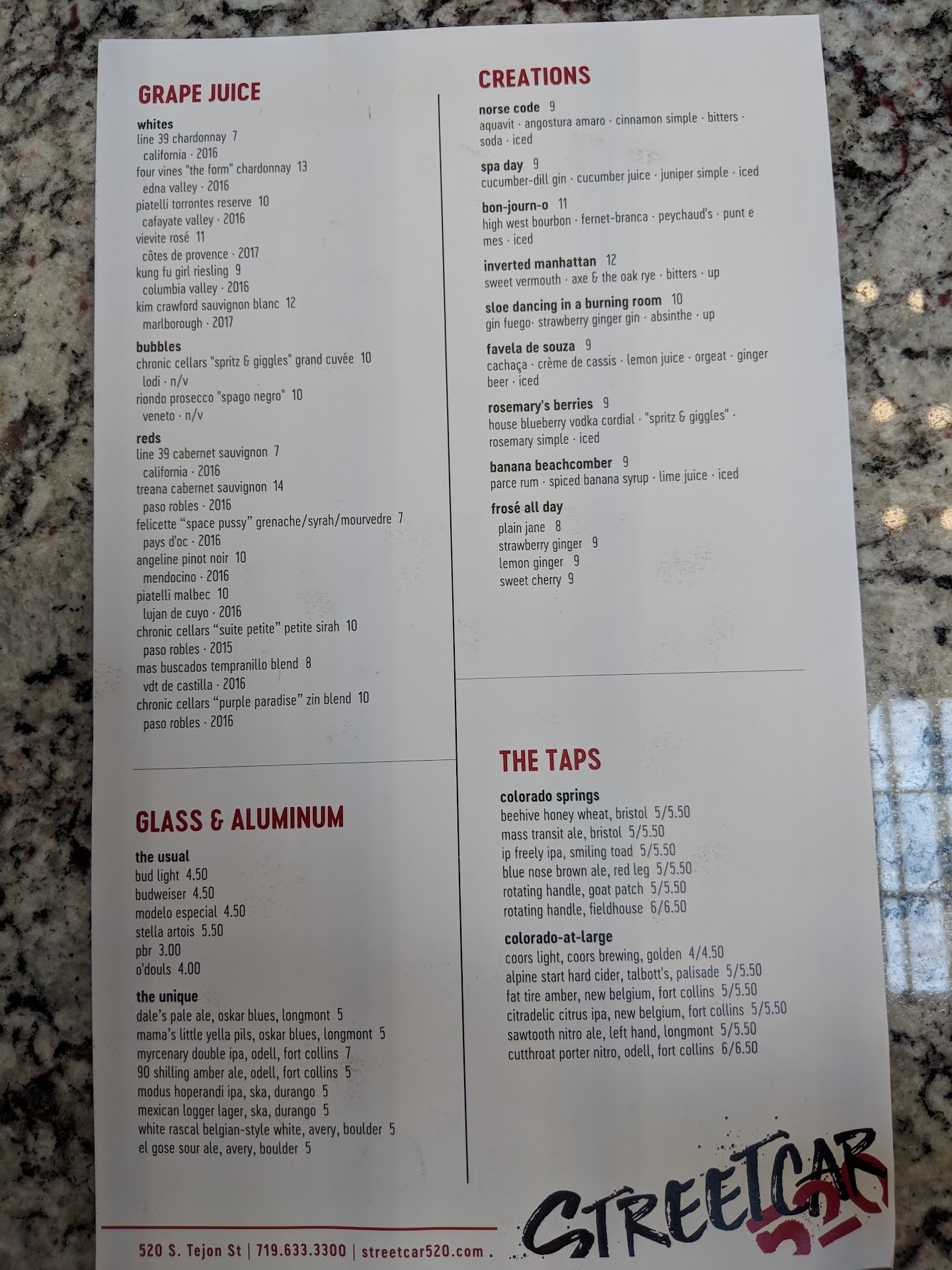 Ari Howard, the owner, wasn’t there for the hour I was, but in my experience she has been every other time I’ve visited. Ari has a lot of industry experience having co-owned the Irish pub that existed prior to remodeling and rebranding the space into Streetcar520. She’s also known to give the best hugs in Colorado Springs – which are probably in limited supply currently, due to COVID.