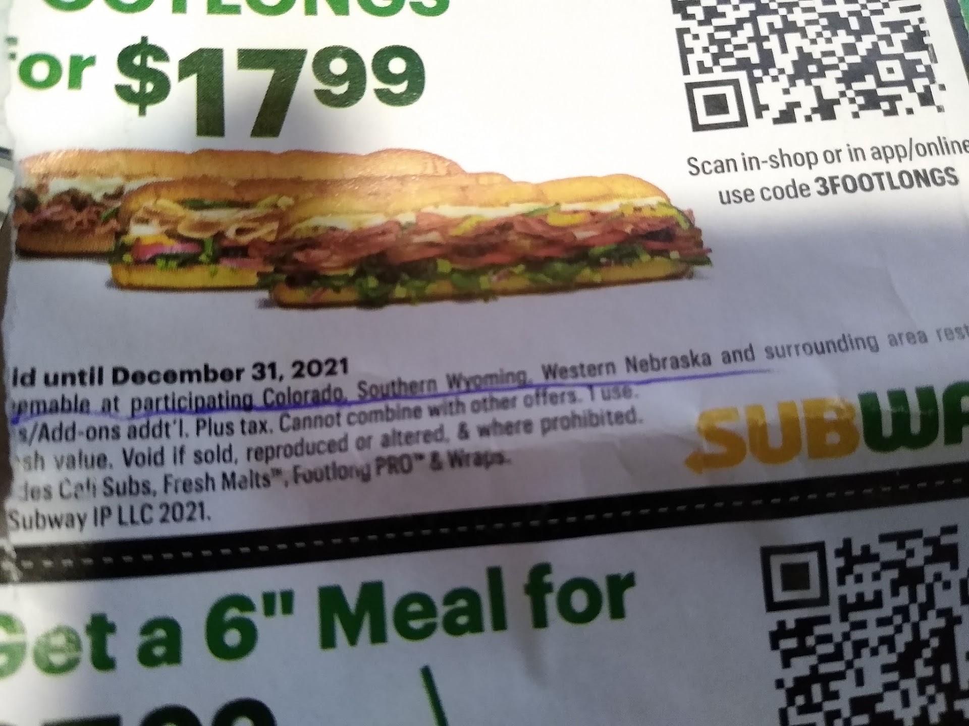 Note to Subway corporate: YOU mailed me the coupons. This is the closest Subway to me. Since you can't get your franchises on the same page, your promotions are meaningless, and your business loses...
