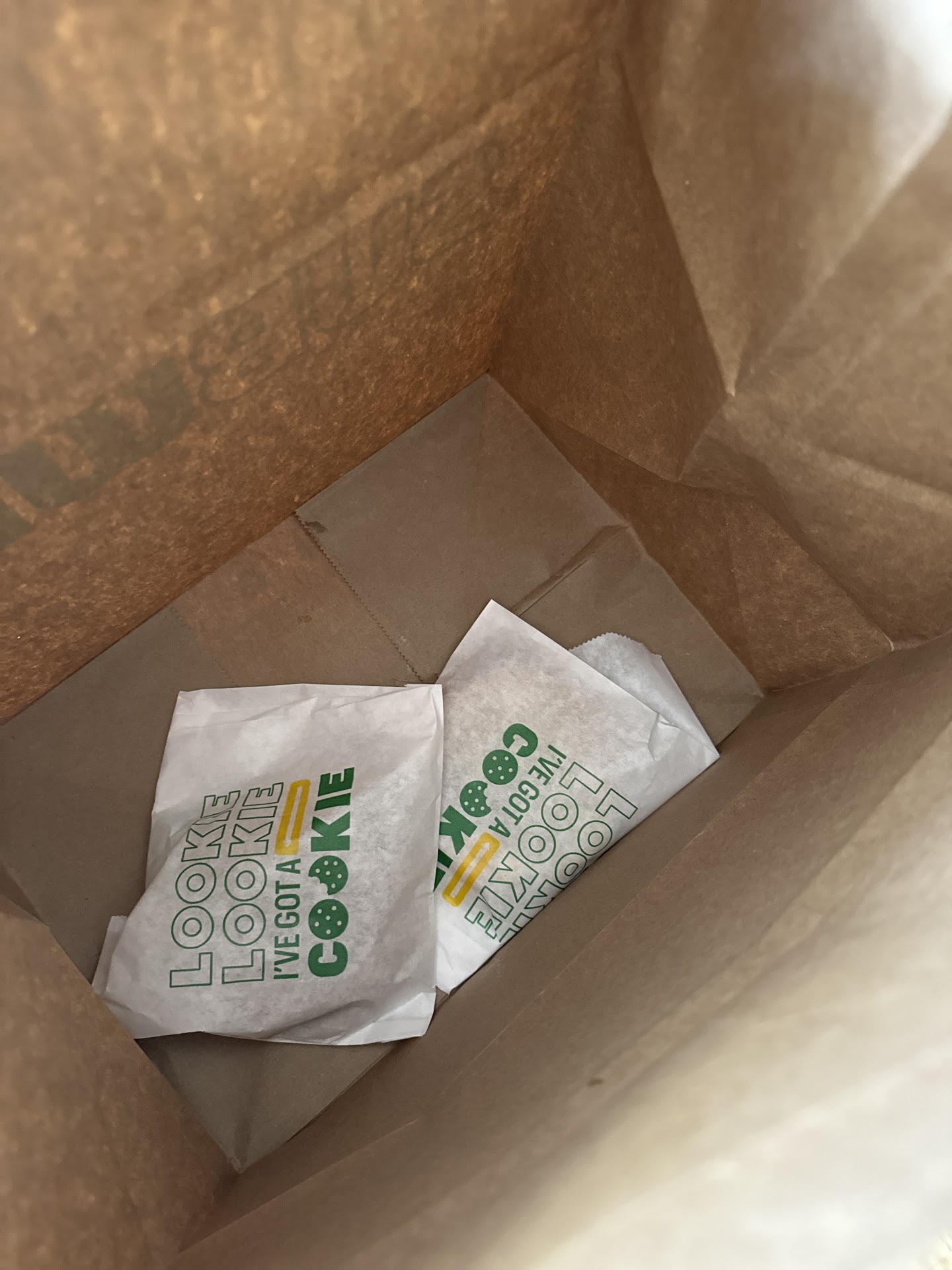 Read moreJust did a mobile pickup order from this Subway location. The only good thing I have to say about this Subway was it was ready when I picked it up. Opened up my wrap and half of it was split completely open with all the fillings falling out. I tried to pick up half of it and realized it wasn't cut in half. The beauty of using the app is picking exactly what toppings you want and they print the receipt and build it based on the receipt. I ordered a chicken bacon ranch wrap. They didn't put the jalapenos and Banana peppers I wanted and instead put olives in it, even though I never put that on the order. They didn't put pepper jack cheese on it, parmesan cheese, salt and pepper. I tried eating it still and the chicken was dry af, didn't taste fresh at all, and the bacon didn't seem to be fully cooked. My fiancé got a bacon ranch sub and his toppings were right except no pepper jack cheese, parmesan cheese, salt and pepper. He couldn't even eat it really because the chicken and bacon tasted so bad and old. To top it off, we ordered cookies. 1 macadamia nut and 1 chocolate. They gave us 2 chocolate chip cookies. 🤦🏼♀️ I really wish I could have watched them make it now looking back. I don't think I'll ever be back to this...