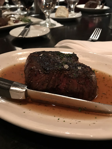 The food was certainly not worth the price. I've been all over America, and been to many different steak houses. This one was definitely towards the bottom of my list. I got the ribeye my wife got the NY strip. The steaks were very decent in size! More than one meal, however, that's about where the praise stops. My wife did seem to enjoy her steak but definitely did not rave about it. My steak on the other hand was a good 10 or so degrees under. I ordered medium rare I got it pretty rare, dark red center and bleeding. Now I'm not too picky and I don't mind rare steaks, especially at a nicer establishment. I thought that it was probably a good quality steak, and the flavor would make up for it... I was wrong, the steak was chewy all the way through, and probably 20% was inedible as it had a lot of cartilage and sinew. The rest of the steak was just bland, it needed salt badly and probably much more than that. I got the Bordelaise sauce which I usually love, but I found this one to be very boring, it barely added anything to the steak. My wife got some of their in house steak sauce which was actually pretty good considering I'm usually not a fan. Other than that we got mash potatoes to share which were not bad but mostly unremarkable. For appetizers we got Cajun shrimp. They were good, not great. Maybe 7/10, and the cocktails were decent tasting and strong.