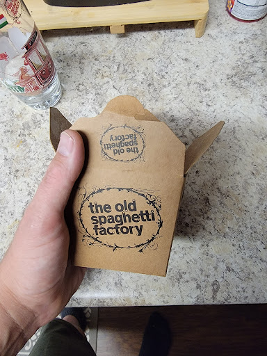 We did get Togo boxes for the breadsticks and the rest of the Fettuccine. The boxes are more like kids play toys. I was able to put two cheesesticks of the 9 I had left in to one box. We had to laugh at this joke. And this restaurant.