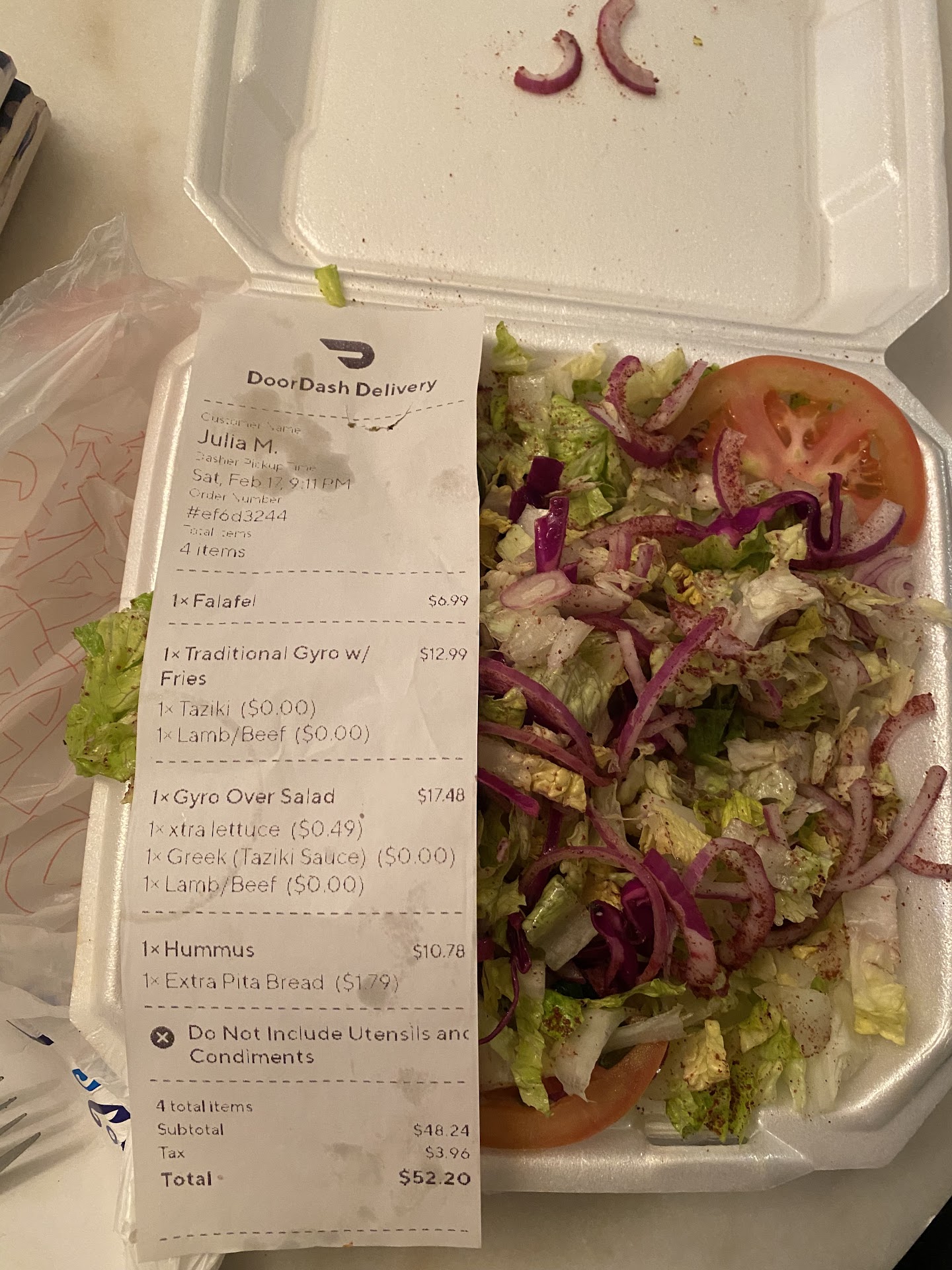 Also the other gyro on the receipt was for my brother in law so . Oh I only eat meat once a week and this was my big event lol so annoyed ! P.s. the door dasher claimed “no English” when I tried to call to have him go back door dash didn’t refund me . Thanks guys!...