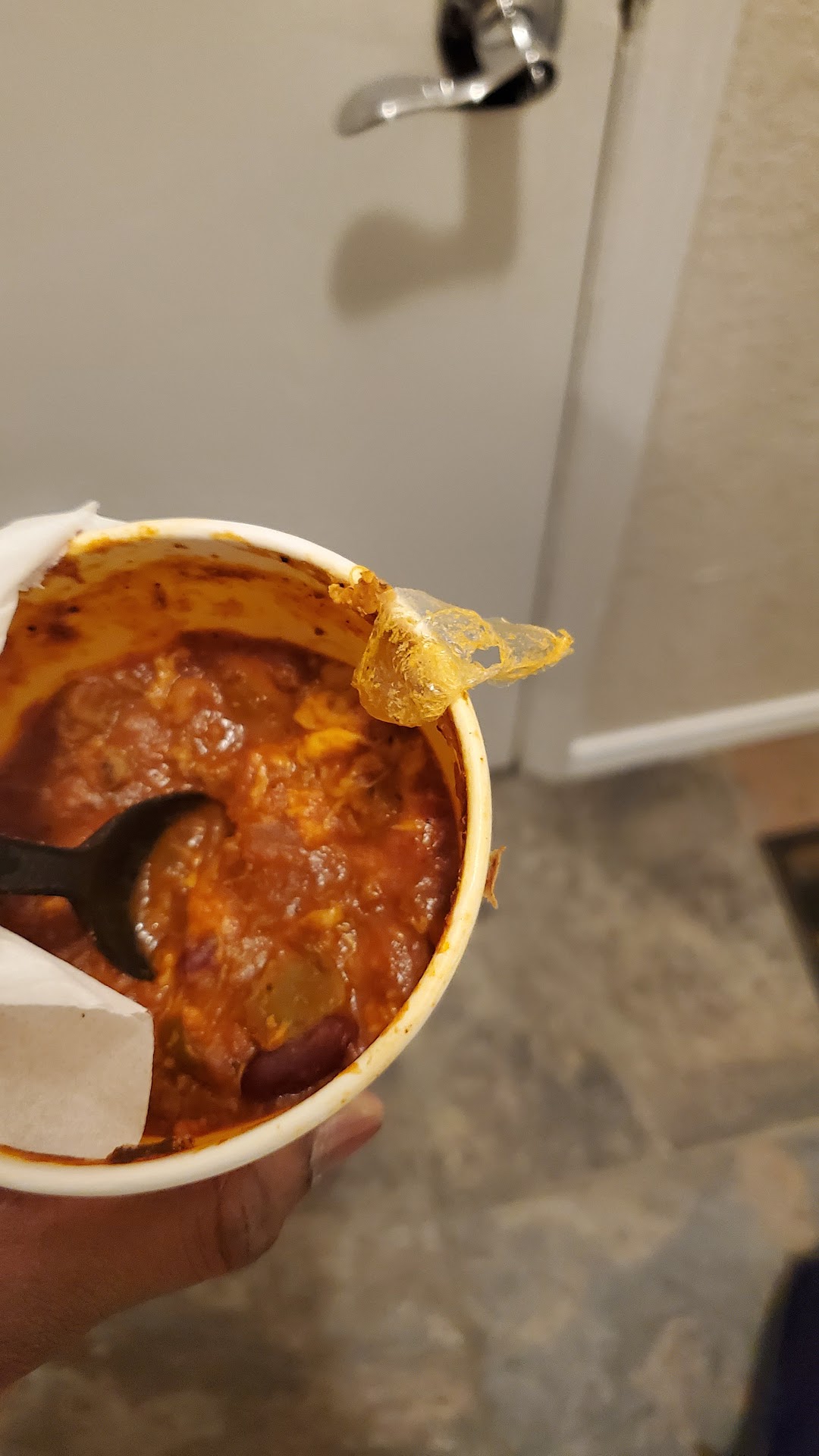 Edit 1yr later: Today I came and requested to have my food made to order. When I arrived to the 2nd window I received a 1/2 box of cold fries, etc. I asked the window clerk if it were made to order and she stated no, stated that my order was not put in the system correctly. She proceeded to correct my order my pouring my cold food back into the grease and again packaging everything back up as if it were just made, to include the 1/2 box of fries. I requested to just get a refund. The girl took my card and she that she would process it. The assistant manager Chelsea then comes to the window stating that she is unable to do a return because her general manager Bianca is on vacation and took her access to process a return. So basically I have no choice but to waste my money here. Everyone was really sweet but the quality of their service is horrible. At this point I guess it's my fault for coming back. Thinking to contact corporate because there is no way this is okay. This is the plastic I was chewing on while eating my chill. Just grateful it was me and not...