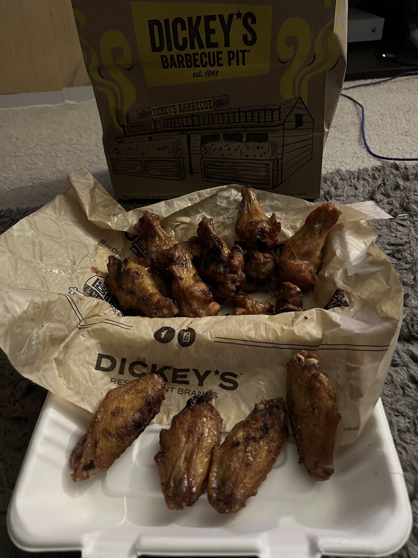 Read moreWe ordered wings from Wing Boss, which operates out of Dicky’s Barbecue Pit Shop, and were shocked to find that out of our order, only four pieces were actual wings—the rest were all drumsticks. We had requested the sauce to be applied to the wings, but it was delivered on the side instead. The fried chicken was hard and had an unpleasant texture, making it difficult to eat. Overall, we were really disappointed with the taste and quality of the chicken. However, the fries and vegetable sticks were good and came in a...