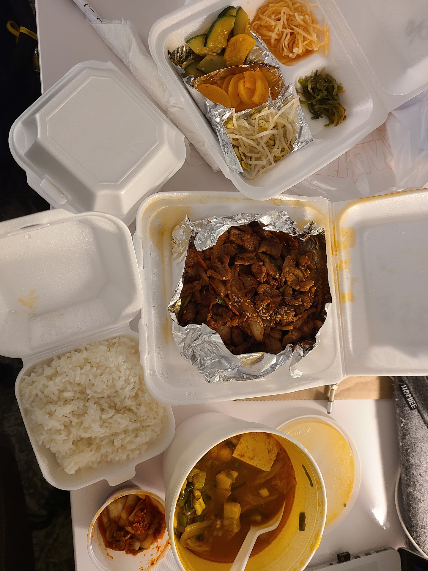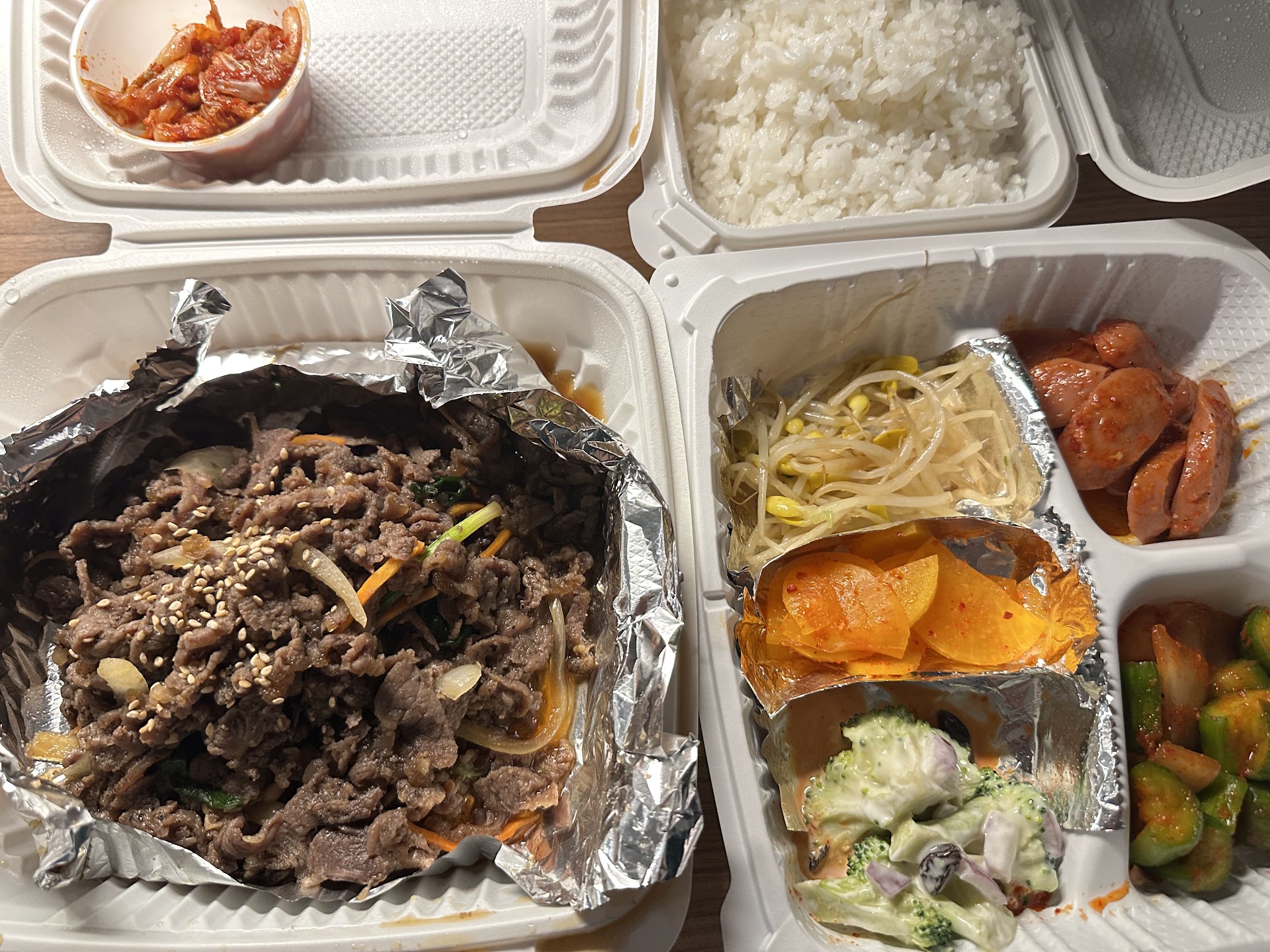 Upon opening the bag, it came with multiple styrofoam to go boxes. The first box contained the main dish: beef bulgogi; the second: Steamed rice, and the last box: an assortment of banchan (side dishes).