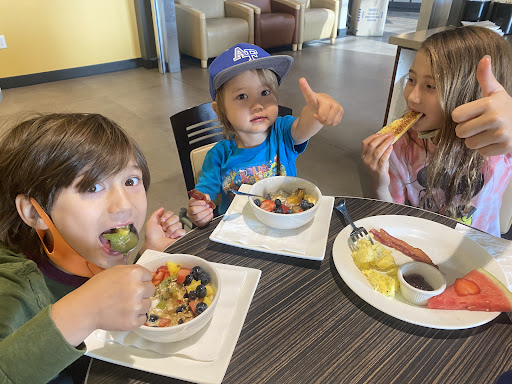 Extra kudos that I'd also give: the dining room is nice and open. My son loved being able to sit in his seat and peer over to watch the head cook plate the food. I appreciated that I could grab the local paper at the sugar, cream, water station. After we were done dining the staff took care of the clean up so it made it nice and easy while trying to juggle our kids.