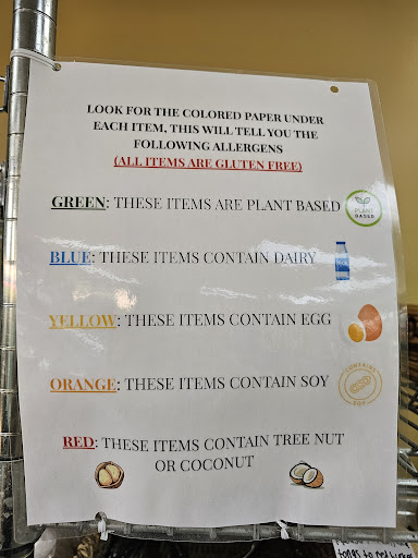 They use a simple, effective color-coded system to label allergens. Each product sits on a piece of colored paper, and each color represents a specific allergen: green for plant-based, blue for dairy, yellow for egg, orange for soy, and red for tree nut/coconut. If a product contains more than one allergen, it will have multiple colors beneath it. This made it quick and easy to spot which items were safe for my daughter.