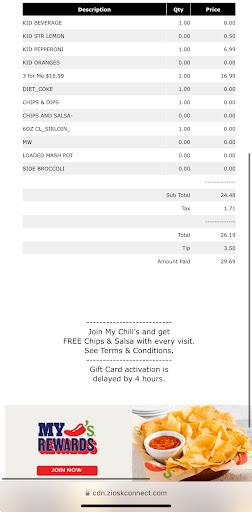 Read moreWent to eat at Chilis today and had a pretty good time for most of my visit. Anyway, I get the check, and there is a $2.99 charge for a “game pass”. I bring it up to the waitress and she responds “yes your son was playing games the entire time”. And of course this was obvious because I’m sitting across the table from him. But I kindly let her know that I, my young child’s dad, did not approve that charge. The waitress responds back that “oh, well you have to approve it 4-5 times before it changes you.” And my response again is that I, the adult, did not approve any charges. It is ILLEGAL to try and charge someone money for a service approved by a CHILD!