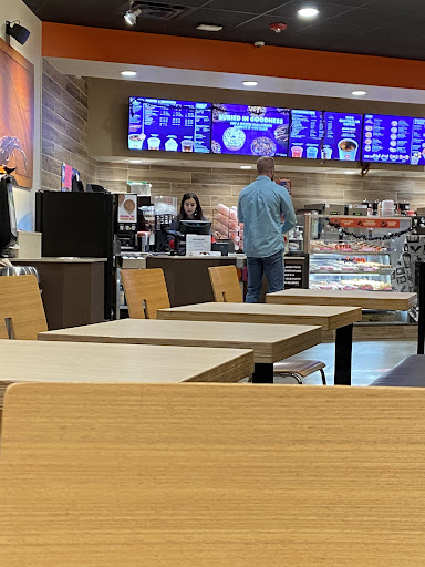 I do this test to see how many people in an establishment are smiling or laughing. Generally, people look happy when they are satisfied. When you go in here, look around at the faces of people who are eating there, working there, or waiting for food. Nobody is happy. Here are some things that detract from the potential joy. The food ordering and the food waiting area are the same space - separated by a retractable tape barrier that every toddler must move, touch, or test its strength. It is very, very chaotic before you order - people stand in the wrong (pickup) line repeatedly. The person taking your order doesnât pick the donuts. The person picking the donuts has no idea what you ordered. So, you order donuts twice. You hopeYOU can remember what you ordered. This is dumb. They ran out of glazed plain donuts on a Sunday. This is completely unacceptable. The individual items that you order are delivered in the chaotic waiting area, without grouping whole orders. So, you might have to go up 2-3 times to collect your whole order. DD - gets some trays or people to coordinate orders. Donât call out items until the whole order is done. Donât call out items, ever. A lot of people order âham, egg, and cheeseâ on an English muffin or âtwo coffees, regularâ. Use Order numbers (only!) when calling out stuff. Then we donât have to fight over coffees. Some things that you need - napkins, straws, are on the side of the line where people are waiting. So you have to go through them with your food. There are 2 tables with a capacity greater than 2 people. Great for families. My sandwich was sad and tepid. So, overall, if youâre familiar with Dunkin Donuts elsewhere, youâll be mighty disappointed with this one. If youâve never been, the coffee is pretty tasty and refreshingly unburned compared to the higher service and better run chain based on the opposite coast located across the street.