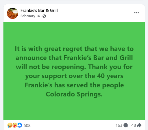 Read moreFrankie's use to be a cool affordable , friendly spot to go. My husband have been going to Frankie's sense moving to the area in 2015. They use to have a kicka** bar tender named Drew, along with an exceptional wait staff. Recently it has become horrible, food for what it is is expensive ...3 burgers, chips w/ dip 6 drinks cost us almost 100. 😩 especially when 2 weeks earlier it was under 70. Wait staff not friendly at all,but if you are a man it's all smiles and giggles. Place calls its the "Country Club off Powers"... interior not clean, always wobbly tables and chairs, no air conditioning feels like a sweat box, my foot almost went through the bar where you put your feet. If you're looking for a cool place , DON'T GO TO FRANKIE'S!