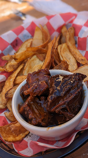 Then the food…man I was wanting and expecting some amazing BBQ, but this was just so bad. I ordered brisket and pulled pork and both were completely flavorless…like they’d been cooked in a crockpot with nothing but water. I had to put salt on it which just felt wrong. I got a to-go box thinking, since it wasn’t seasoned, that my dogs could have some. Then the “French fries”….which were wannabe potato wedges except they were as thick as a nail maybe? Also zero taste- neither crispy nor soft, and definitely not seasoned. The baked potato was OK, HOWEVER, the servers forgot it in the window and my friend waited 10-15 minutes for it & we had to flag someone down- no one checked on us before to see if we got everything…waitressing 101. The pork sandwich was so bad that my friend who was really hungry only ate half, and my husband said the burger was decent. But a BBQ place should have good BBQ, right?