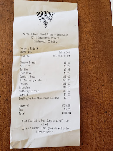 Read moreBeing a New England native and having access to Boston's North End, New Haven iconic pizza parlors and New York City pizza joints, I believe I know good pizza. Marco's has good pizza. Here's my problem with Marco's and why I did not give five stars: Their pizza crust is SO great that it shouldn't be wasted. The leftover end crusts BEG for olive oil dipping. I have rarely been to Italian restaurants that did not bring a basket of bread and olive oil to the table as soon as guests have been seated. Marco's pizza crust has that great chewy, glutenous mouth feel and after devouring the slices, those chewy end crusts are just pushed off to the side. Instead of dessert I would prefer some good EVOO to dip those leftover crusts in. Aside from no olive oil for dipping the crusts, I thought the waitress was a bit on the rude side. She was definitely very busy handling many tables but didn't have to exhibit her inability to cope with that kind of stress to the diners. Aside from no olive oil for dipping and an overworked waitress, I would definitely return. The pizza is made using the highest quality ingredients and I loved it. If the crust is not chewy, then it is not authentic, in my opinion. Cracker-type and wonder-bread-type dough just does not work. Marco's pizza is the real deal. I work at a grocery store in the DTC and am telling customers (many of whom are business people staying at DTC hotels, most of whom are locals) to try Marco's. I will definitely go back and next time will ask for olive oil for the crust ends dipping. Best pizza in Denver. UPDATE 12.30.24: Was going to order my fave Del Re pizza today but when I saw the price of $25.20 I almost passed out. Would never go that high for pizza. As far as I'm concerned they've passed the price point...