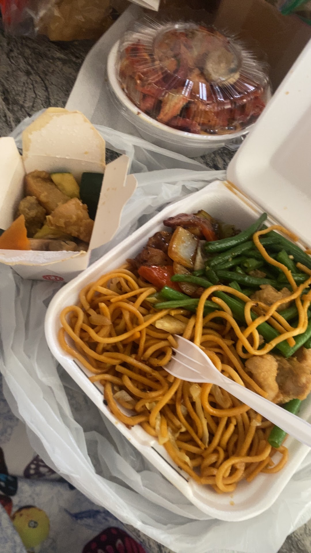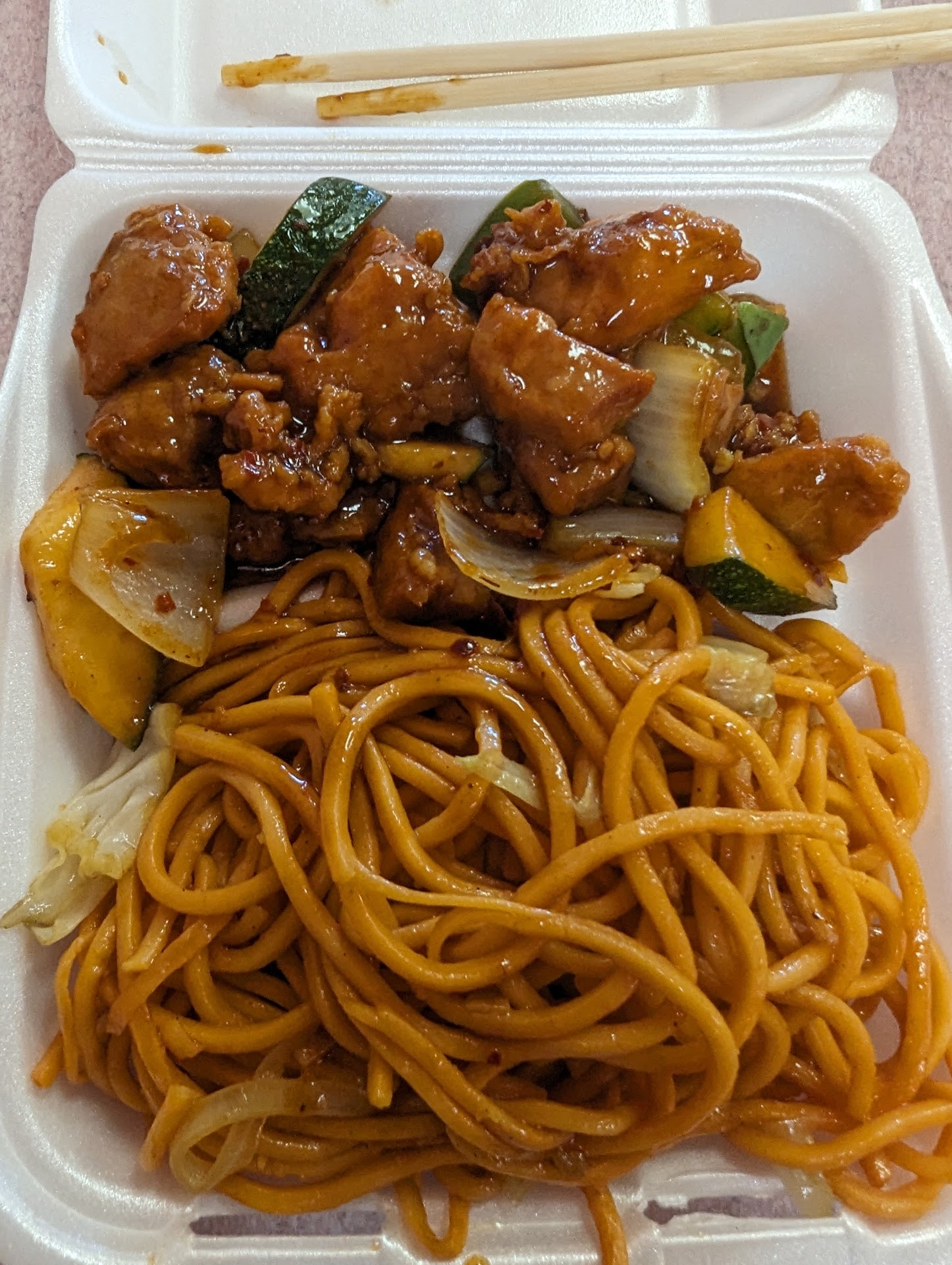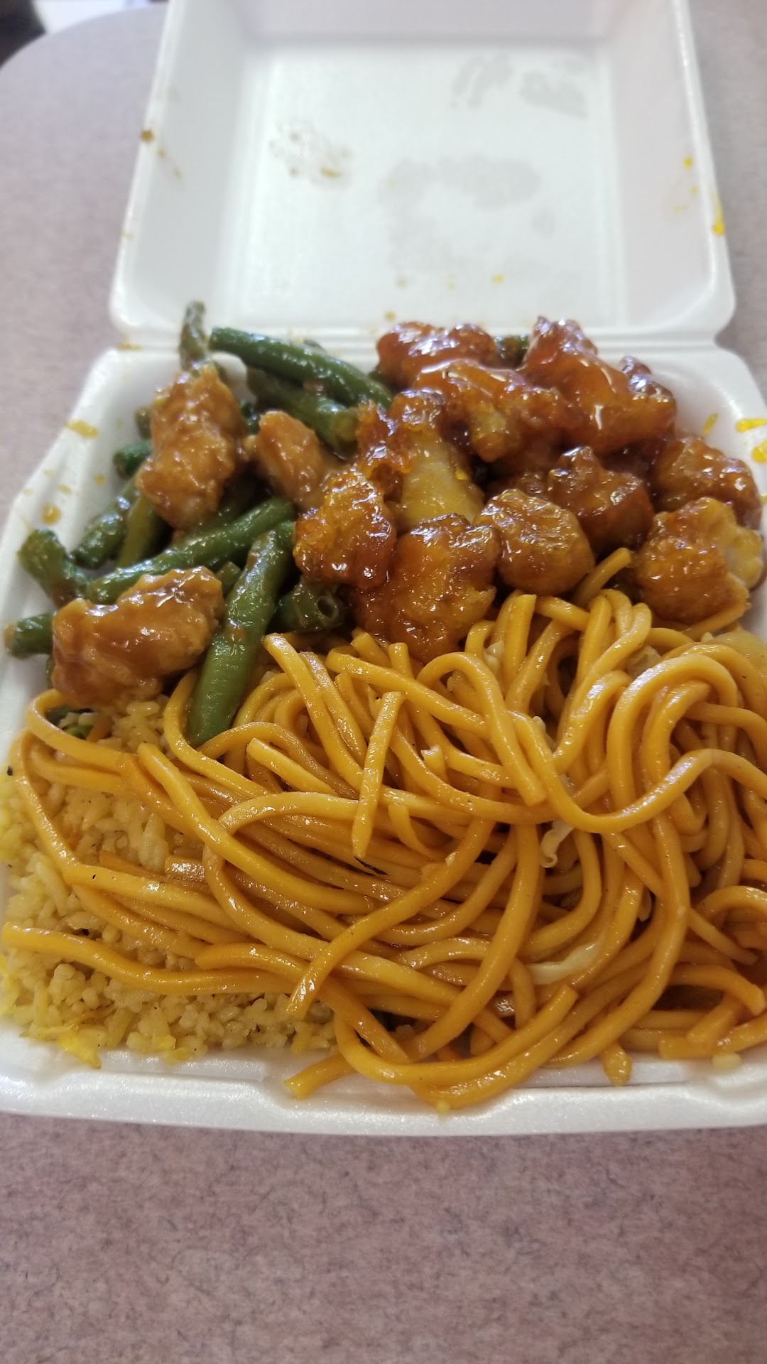 The item I got was the bowl. In the bowl you get either rice or noodles and one protein. Let me tell you, just get the combo a. It’s the same price and you get more food. That was my first mistake. My second mistake was getting the orange chicken. Barely had any flavor…you could hardly taste the sweetness. It was like chewing on squishy wet chicken tenders. The noodles in the other hand, had flavor. Had to stuff my mouth full of noodles after each bite of chicken.