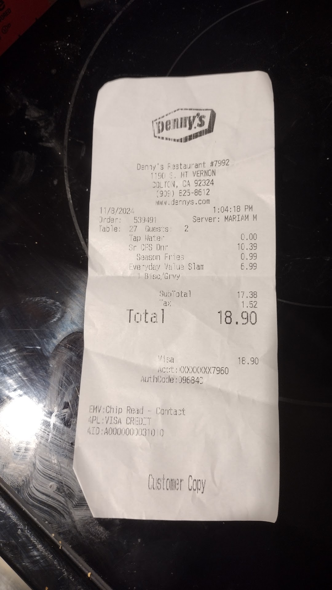 Read moreThis Denny's in Colton was the slowest of any I've ever been to. There's nothing good to say about this restaurant on the day that I was there with my friend. I ordered country fried steak from the senior menu. It says you can choose two sides to go with that meal. From the sides menu on a previous page I chose seasoned fries and corn. My country fried steak had very little gravy on it. The seasoned fries were good. And the corn was tasty. Maybe a little too much pepper on the corn. Although I did not add any. From the time we ordered till the time we got the food seemed like an hour. The restaurant was not busy at all, there were just a few people there. The cook must have been on break or something. The waitress apologized for the delay when she brought the food. When I got the bill there was an extra charge for $.99 for seasoned fries? I looked at the menu and there was no extra charge for any side dish. When I got to the register I questioned the cashier about this extra charge. She showed me a small red box in the middle of the hamburger page that states there is an extra charge of $.99 cents for seasoned fries. I objected to this charge and refused to pay it. Claiming that the statement is on the hamburger page and not in the sides section next to the name seasoned fries where it should be as well if they're going to charge for it. They tried to get me to pay for it but I refused. Told them to change the menu. She took the charge off my bill. I will never visit this Denny's location again. You don't get a second chance to make a...