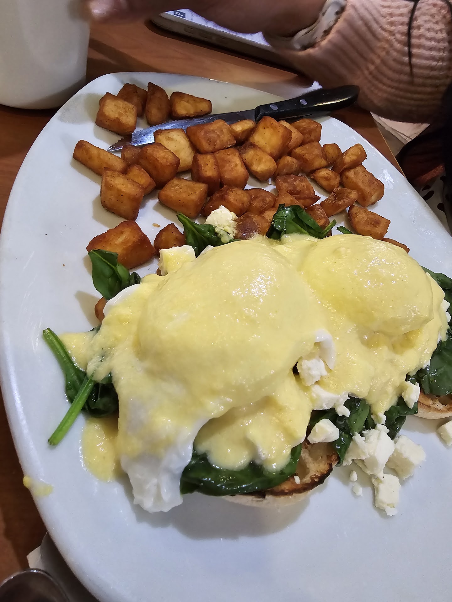 Read moreAs mediocre as it gets when it comes to breakfast places. We got the Florentine Bemedict with breakfast potatoes, which wasn't terrible, to be honest (3.5/10). The "hungry man platter" was a completely different story. Eggs were hard, and the cheese I asked for scrambled in the eggs was just sprinkled on top and not even fully melted. The bacon was hard, and sausage + kielbasa were tough and rubbery. The pancakes were pretty bad as well. Now, when I ordered a mac n cheese with bacon from the apps portion of the menu, I'm not sure what I expected, but it certainly was NOT Kraft with some hard bacon just dropped on top of it. I was genuinely shocked when our server brought that out.