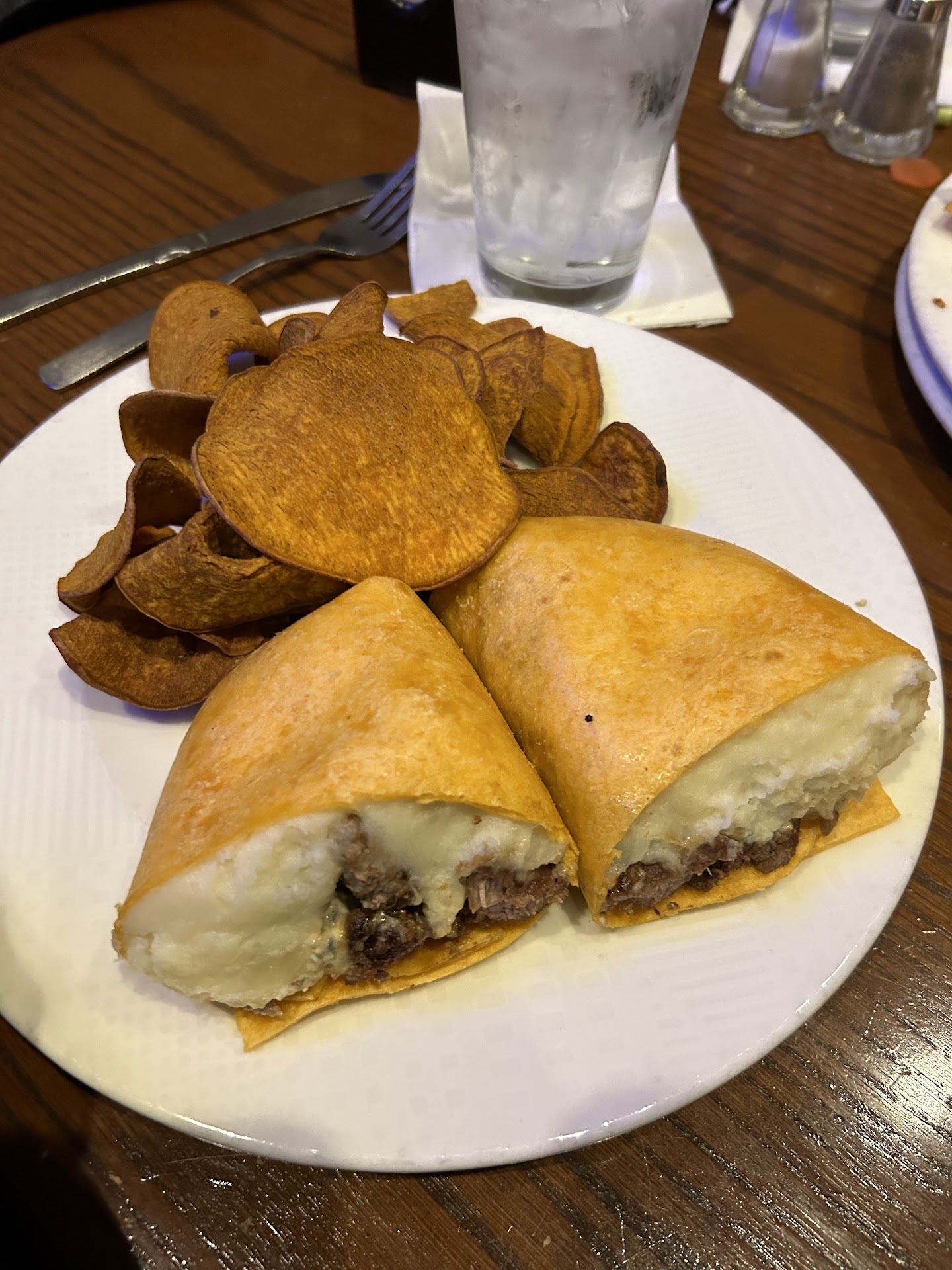 Bleu Steak Wrap - Grilled marinated steak sautéed with mushrooms, wrapped with blue cheese and mashers in a soft tomato tortilla. Steak was semi-tender, the blue cheese was very nice and the potatoes were EXCELLENT. Overall the meat could have been a bit more tender and im not sure it really lends itself to a "sandwich". Id pass on this one. Sweet potato chips were fine.