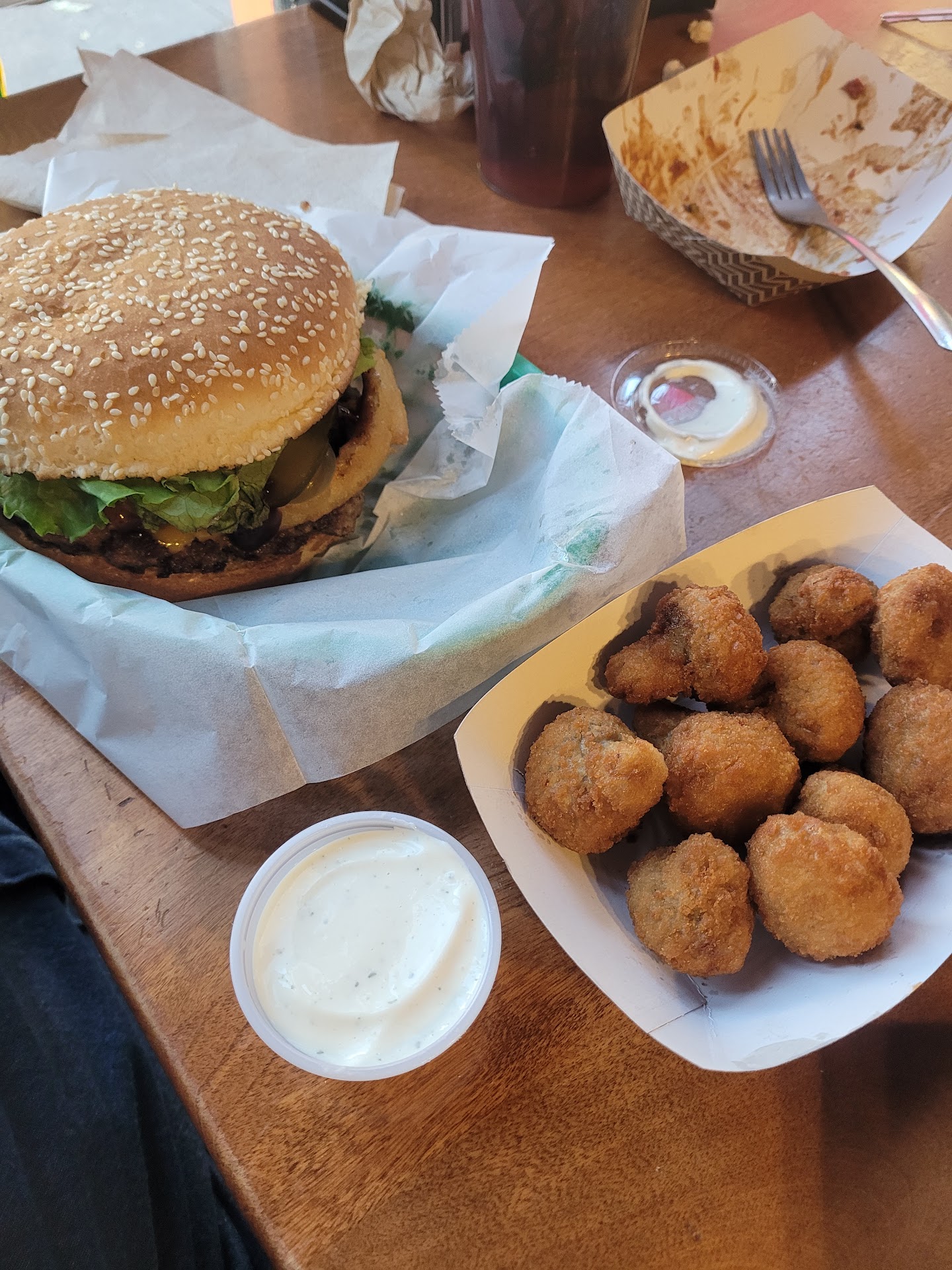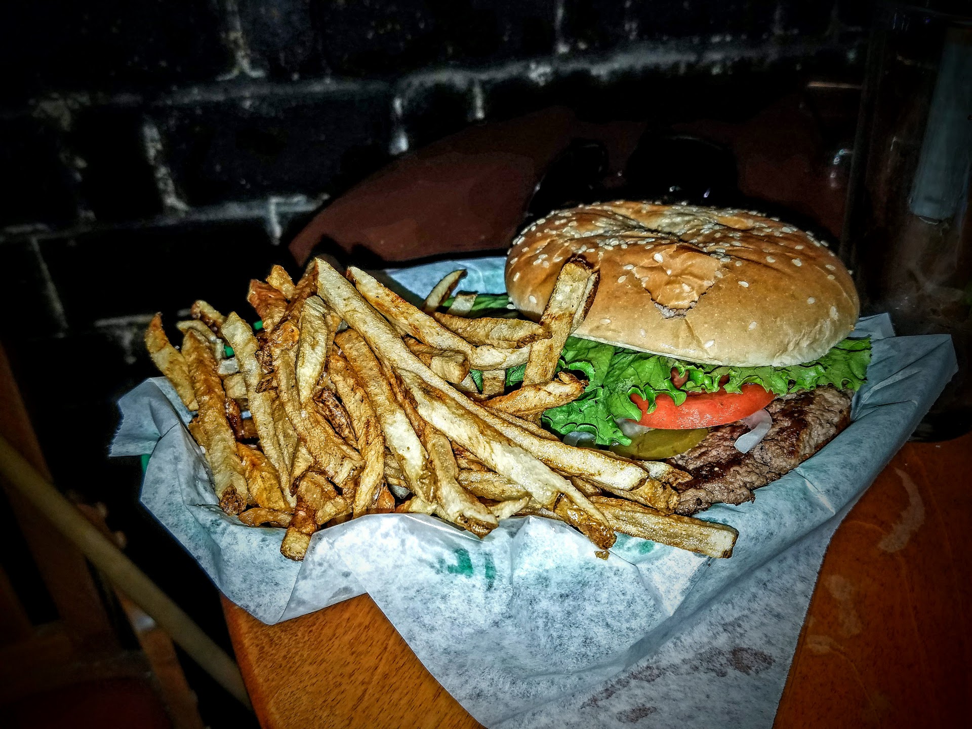 Okay, I grew up in the resturant business and can understand a large table top coming in and slowing things down. However, forgetting about your smaller tables is a huge no no. Things started out great. Then our waiter disappeared and didn't come back after we placed our order. However, we were a bit slow to order so we understand possibly having to wait a bit longer for our food. We had our two little ones with us and our two year old was starving...a two year old toddler can chew off your arm in case you have never known one! We did order the fried pickles with our drinks...which did not come for over 30 min. Did I mention that my beer was piss WARM? And our son was getting loud bc he was hungry and I was not ready to sacrifice my arm... We watched the other tables get served while our kids went hungry and my arm became more and more in jeopardy of getting a chunk taken out. Did I mention my husband's beer was piss warm too??? Still no waiter. Over an hour later our food arrived. The "famous" French fries would have been fantastic...if they hadn't been served ice COLD. All of them. I guess that was good for the babies so they could finally eat something! We had ordered a double burger...and got a single which was the same thickness as a McDonald's burger...and we hate McDonald's. I am still confused at why the chicken strips and small burger were hot but the fries were COLD. We also got the "bout died fries"....the chili was good...but there were hardly any fries with the chili and "fries"???! Guess I can give credit where its due and say that the flavor of the burgers, fried pickles and side salad were good. The flavor of the cold fries would have have been very good too....but if you love French fries you know that cold fries are AWFUL... especially home fries! We would have let them know and try to get fresh fries...but no one ever came back before the kids had finished eating, while I sat wishing that I had HOT French fries and COLD beer. We won't be back unless we just want to play pool...and grab a COLD drink, from ACROSS the...
