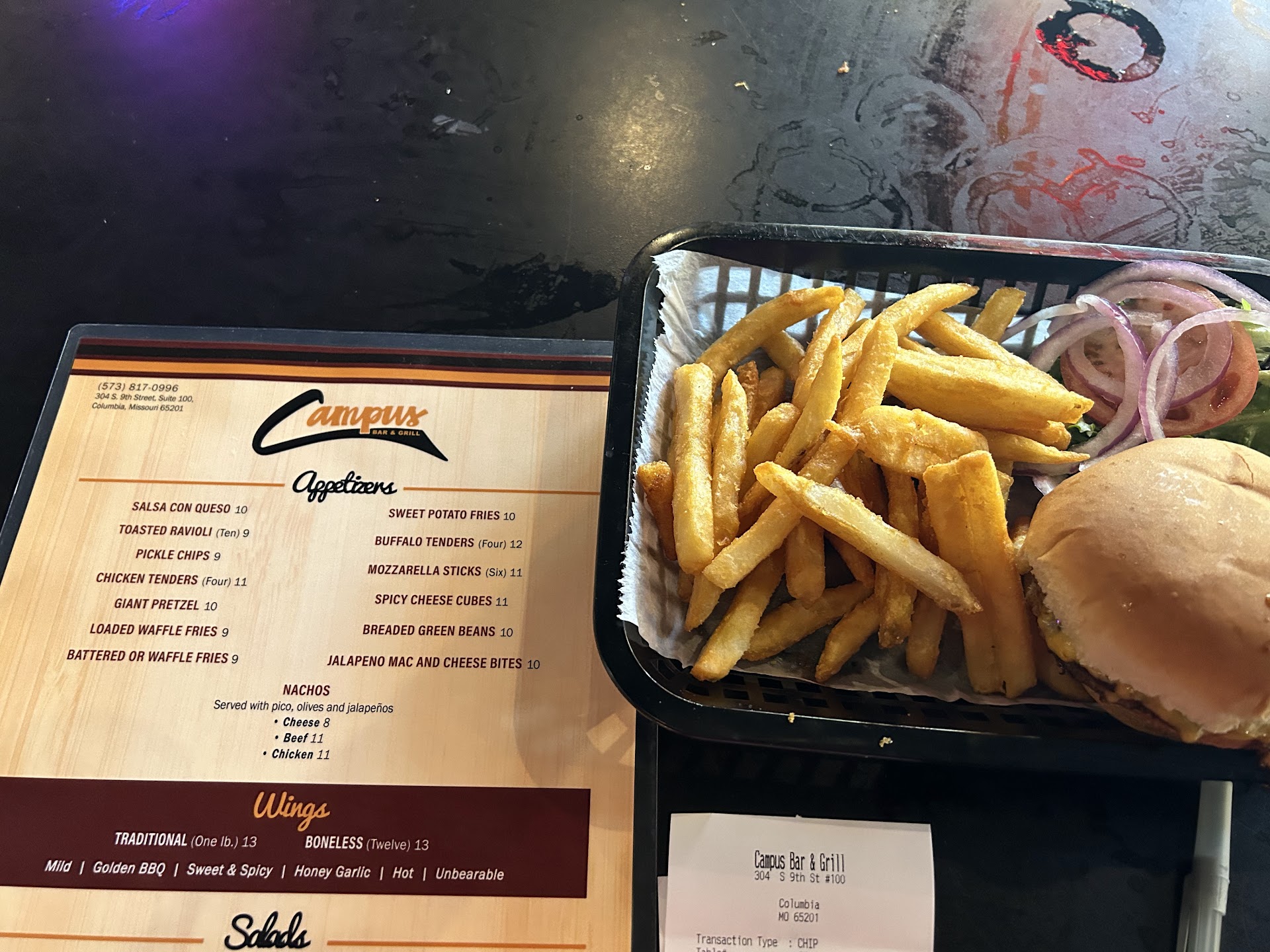 Ā Ā Ā Read moreNot sure if my standards are too high or if they should be lower since this is a college "place", but the only thing positive I have to say is that the prices are cheap. However, you get what you pay for. Some of the food is obviously frozen from a bag. Some of the food is prepared fresh, but that doesn't make up for the appearance and smell. The bar area has a smell of vomit and the floor is sticky. The walls are covered with something that hasn't been cleaned in forever. And do not look up. There is a layer of dust and grime above the tables that would make anyone cringe. I hope none of that fell on our table or food while we ate. If management thinks this place is acceptable, I would hate to see the kitchen area. The only reason for two stars is the price of the food and the service was decent, though it is obvious they are understaffed. They need to close this place for three weeks and clean it well because it would take that long...