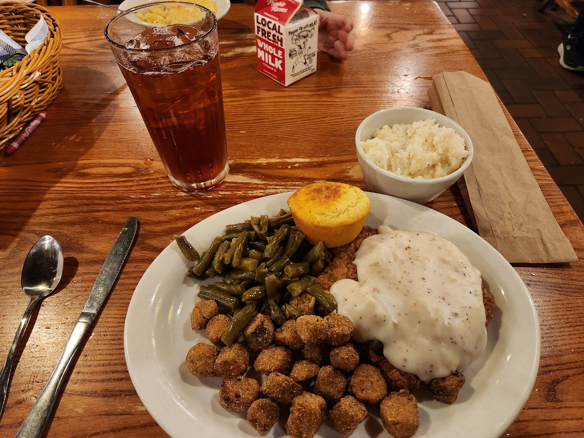 When we got our food, my son's mac and cheese had some brown looking stuff in it that looked like a potato skin. We don't know what it was...maybe burnt cheese? I had the chicken fried steak with okra, green beans, and grits. Everything was good but the grits as they were served room temperature.