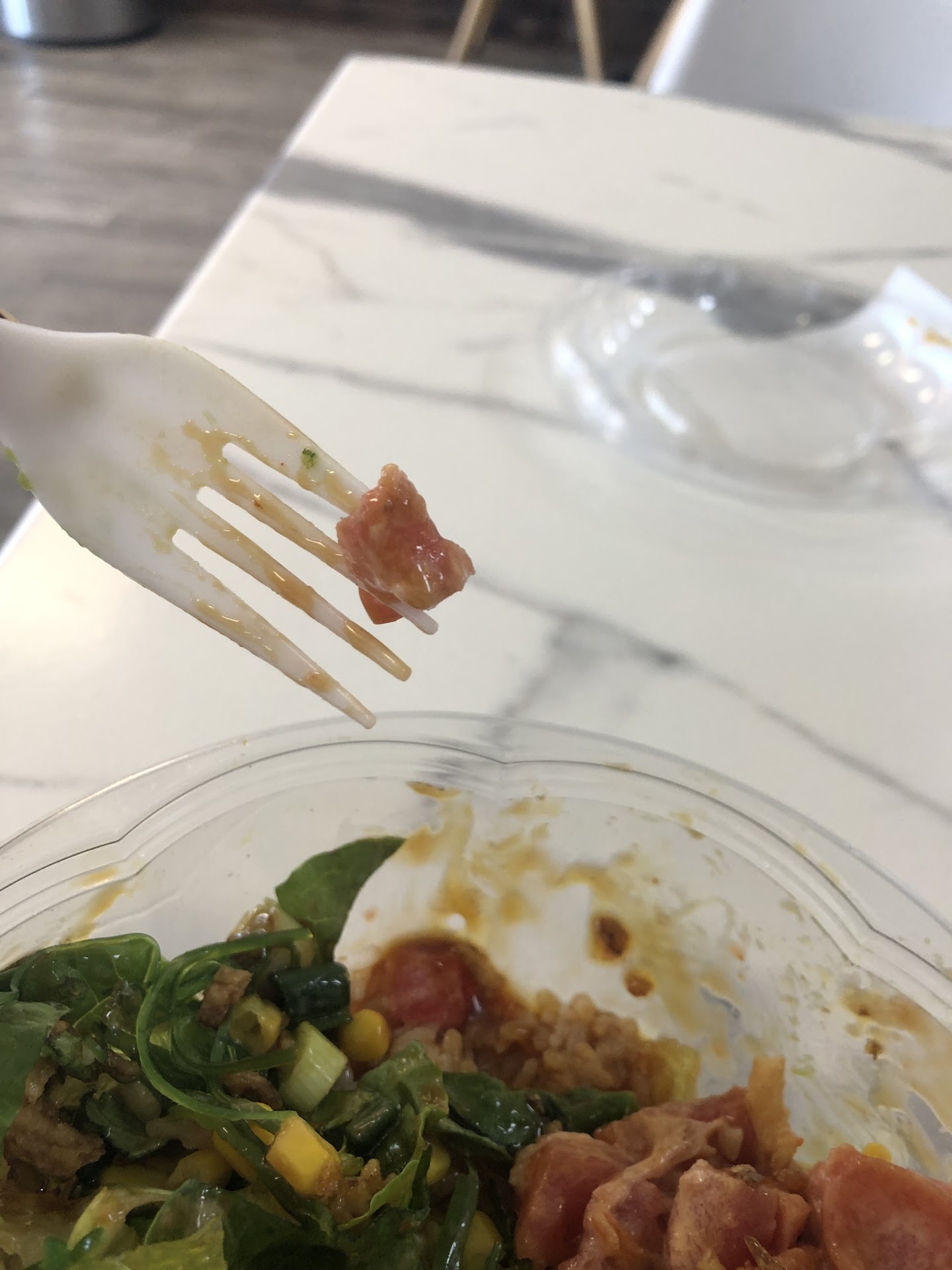 Japanese food is supposed to be where food meets art. My wife and I went to get poke bowls. First off my thru messed up both our orders. My bowl was a mess. I had two proteins and they were buried in one corner but words was the handling of the fish. Poke is supposed to be bite sized cubes. I’m attach pics cause they weren’t bite sized or cubed and one peice was just disgusting.