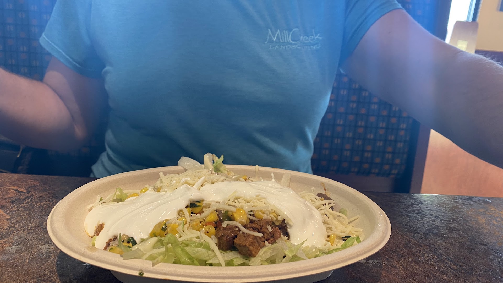 I had a burrito with Cilantro Rice, Steak, cheese, lettuce, pico and sour cream with Nachos and Queso on the side.
