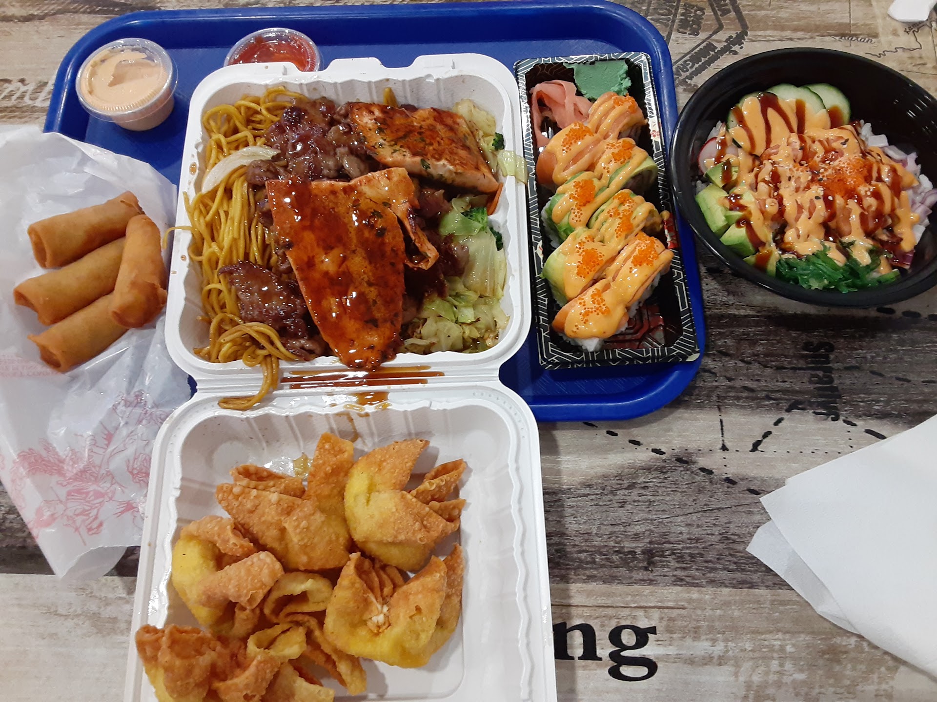 New fave! Went with a friend and tried several items. Would pass on the spring rolls in future. Crab rangoons were pretty good. Quickway roll (spicy crab & shrimp roll topped with salmon & avacado) was fabulous! Plenty of ginger and wasabi on the side. Friend had the beef/salmon w/ noodle combo. Enjoyed the taste, plenty of food - enough for leftovers. Said the salmon was dry though. Poke w/ cubed salmon (like a salad) on a bed of rice was delicious! Looking forward to trying the Bento box as a take home. Place was clean but chilly to dine in because it's small and lots of folks were coming and going (pick up orders), but some stayed to dine it. I imagine there won't be enough seating when weather warms a bit! There are only 5 tables w/ bench seating. Oh, and price...