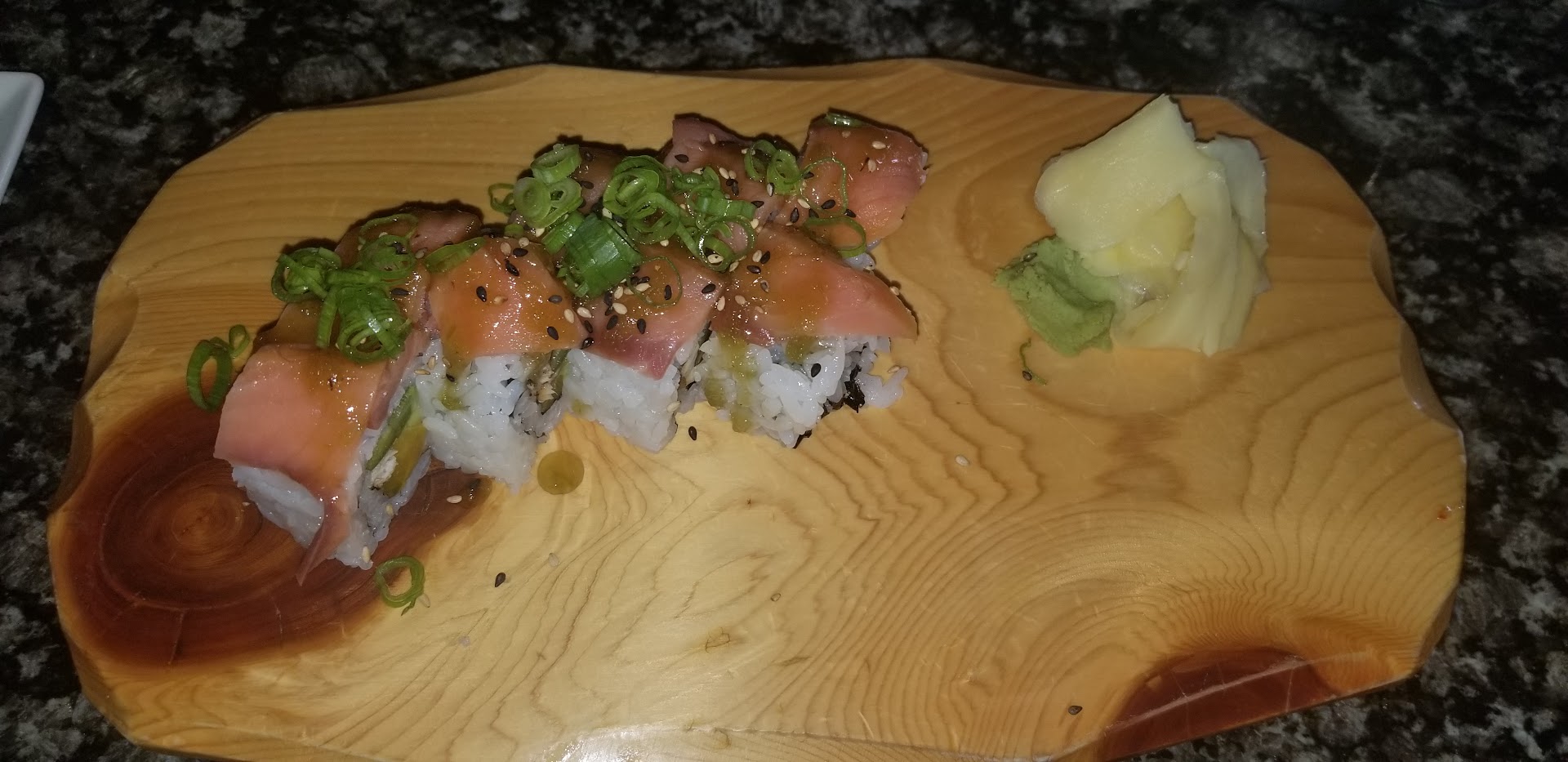 The fried Brussel Sprout salad was a great way to start the meal. With the included lemon slices squeezed on top, this is a must try appetizer. The Lemon Drop sushi roll was also tasty. Think of it like a California roll but with added salmon and thin slice of lemon on top. Safe roll to have if you don't want something too flashy. Another safe roll is the Rainbow roll. Also let's you try different types of fish as well.