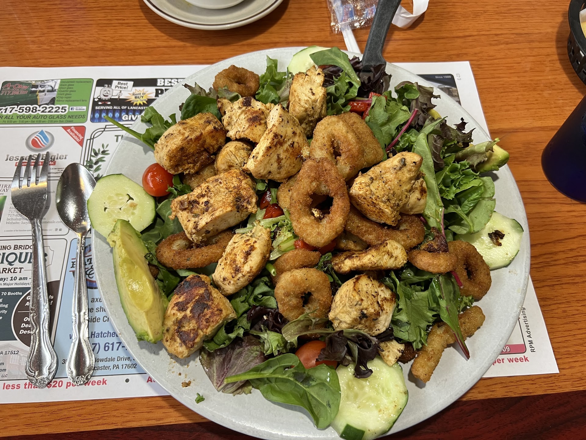 Both my wife and I got salads with chicken on top, and the chicken was tender, flavorful, and hot. Salad greens were fresh and the salads were appealing to the eye.