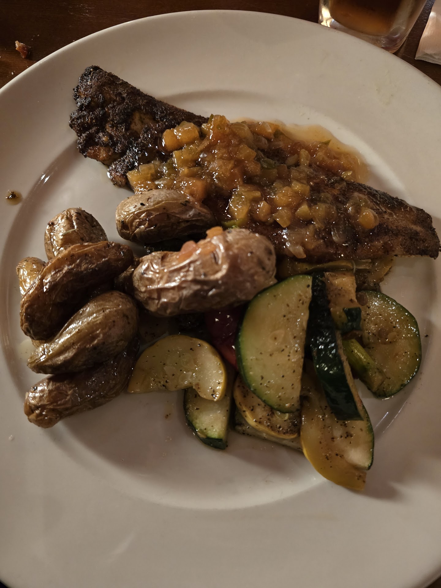 I ordered the market catch (red snapper) with peach chutney with sides of potato fingerings and vegetables and it was pretty good. The vegetables were perfectly cooked (not too raw but not mush). The red snapper was cooked a little too much so the meat was tough and kind of chewy. But everything was flavored really well.