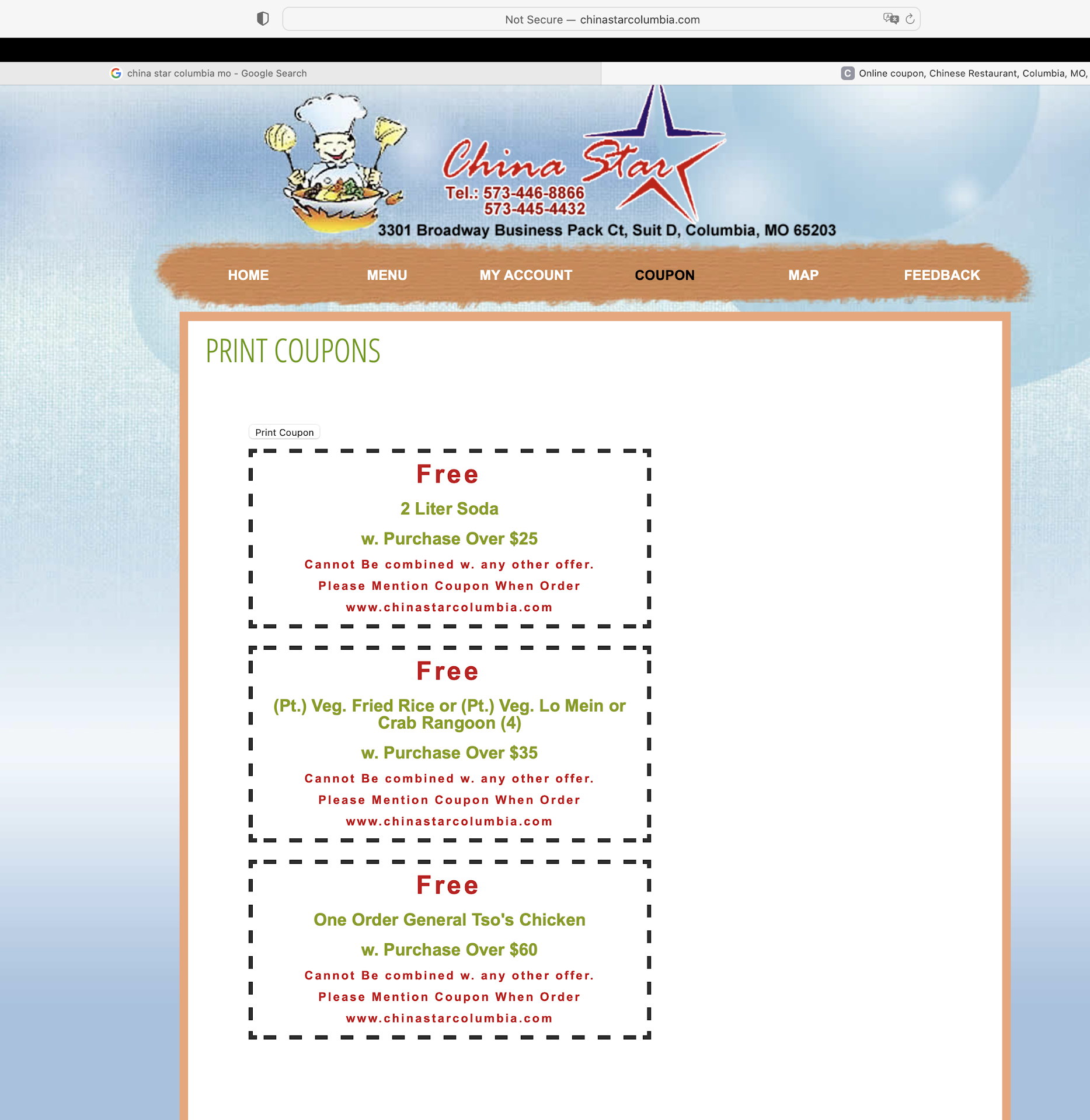 However, I had a recent annoying experience whereby they had a coupon for a free 2-litter on their website that didn't specify any restrictions. I called to make sure I had attached it correctly to my order and they refused to honor the coupon because it was "only for in store." As the web order had already been charged and I couldn't cancel it, I decided to drive there to get my free soda (along with my order), they only refunded me $3.00 (from the $3.50 delivery fee that had been tacked on), and they passively aggressively circled the restriction on the menu they attached to my paper bag with the food. Given I'm sure they recognize my number as a somewhat regular customer, you'd think they'd just honor it and update the online coupon.
