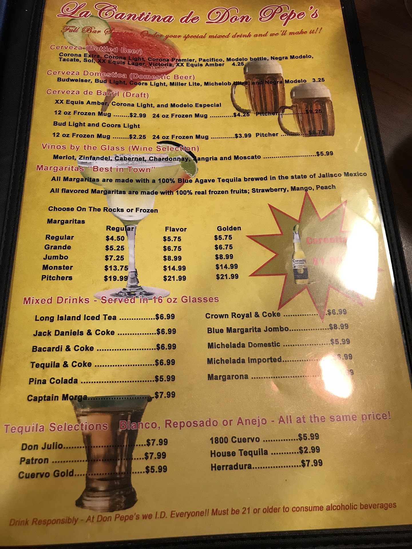 Ā Ā Ā Read moreI wish I could give a zero, I ordered a frozen margarita and there chimichanga Don pepe. The margarita was terribly made and barley frozen/slushy at all, nothing like a frozen Margarita should be. It was basically melted by the time it was at my table. My food was also very disappointing as it was such a small serving it's was disgusting. I have paid less for the same meal at La Fuente just 5 minutes away for more then twice the food which of course means I always have left overs. As I can only eat about half of it, but I always look forward to the delicious leftovers from them. I came to Don Pepe to try it out as I have had 1 person tell me with was worth trying at least once and another saying there weren't worth the trip. I decided to see for myself as it was 50/50 and will never return. Such a waste of money just to go home and eat hot pockets instead. I will stick to La Fuente from now on, the food is better, cheaper, and the service is better as well. At least they always make sure there customers are satisfied and offer replacements if not. I encourage others that frequent Don Pepe to try somewhere else at least once because I have never been to a worse Mexican restaurant as this and I am sorry if this is the best...