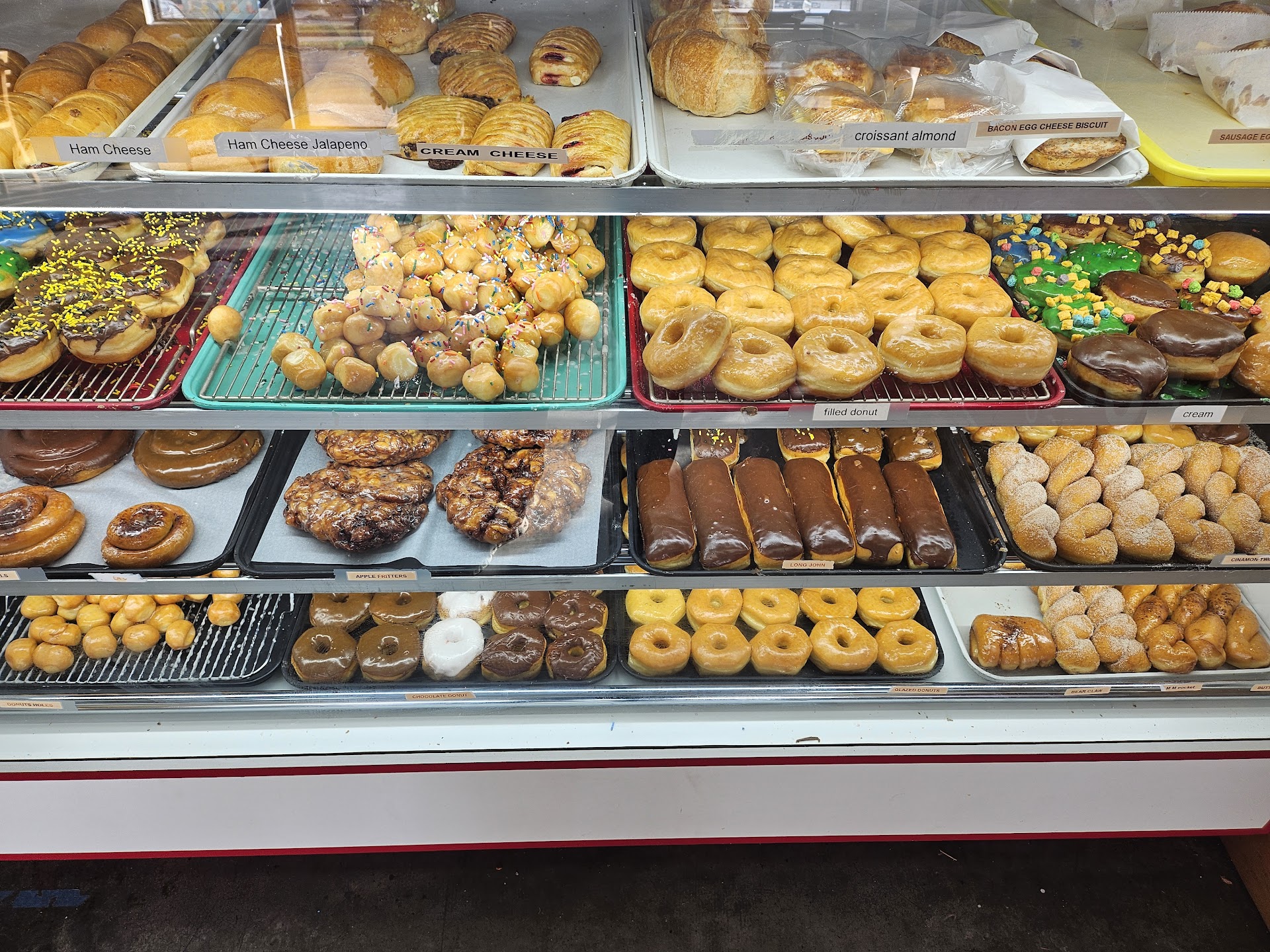 Now....the product..... The donuts are, hands down, the absolute best in the area. The fluff or creme filled long Johns are absolutely fantastic! The donut holes are soft and perfectly glazed. The apple fritter is HUGE and filled with cinnamon apple chunks. My girls love Boba and are always excited to see what interesting colors the donuts will be painted with on each visit. If you want something a bit more savory, they have ham and cheese croissants or kolaches (other flavors available). I have yet to try a product that I didn't like. I need to go back as soon as they open, to be honest. They have several fillings for the donuts and I want to try all of them. The prices are so reasonable, I may try all...