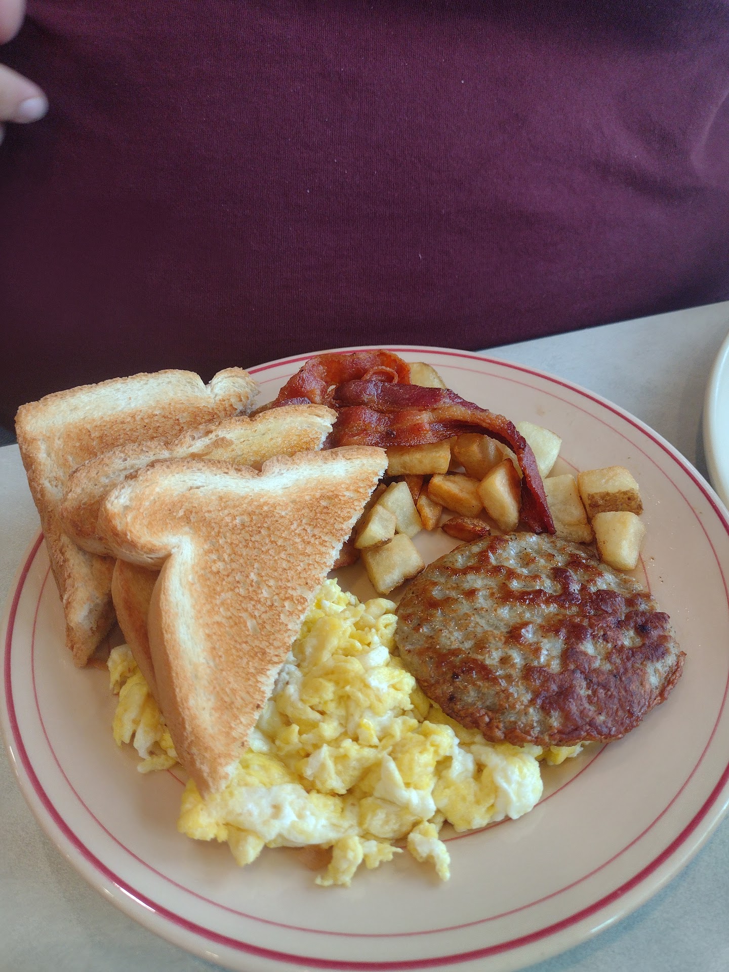 Read moreMy fiancé and I stopped in for some breakfast Tiffany was very welcoming and had a really nice vibe told us to sit wherever we'd like. It has a cozy feel and is decorated in antique memorabilia which I found endearing. The menu has anything you could want for breakfast, I got the frizzed beef gravy aka creamed chip beef over toast and potatoes and my fiancé got the champions breakfast which comes with two eggs, potatoes, toast, pancakes, bacon, and a sausage patty. First off the bread itself is delicious we both had white and it was so buttery, the bacon was fresh and cooked to order not cooked in a large batch then kept warm, the eggs were perfect, the pancakes had this sweet buttery smell that was irresistible and there was so much food I could barely finish. The potatoes aren't your normal homefries they are more like fried cubed potatoes which I personally preferred because they were all nice and crispy and had the perfect amount of flavor. Everything was seasoned perfectly and Tiffany was even kind enough to offer drinks to go if we would like. Now that is service! Will...