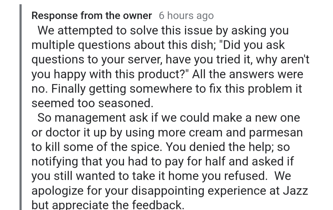 Read moreSince I am new to the area, I decided to stop in and try something from Jazz A Louisiana Kitchen, one evening after work. I ordered the crawfish étouffée. I waited for the order, which didn’t take long. I paid and left with my order. When I got home I opened the container, and it was nothing more than a container of grease, which tasted horrible. I called the restaurant immediately and asked for a Manager. A manager came to the phone and identified herself as Brittney. I explained to her that the food was not edible. This is where everything went down hill. She asked me to return the food. Although tired from a long day, I obliged. Upon looking at my credit card info online I noticed that I was charged at extra $4 for the meal. It appeared that the hostess charged me for taking my order and going to the kitchen to retrieve it for me. Without my consent she had charged my credit card. When I arrived at the restaurant to return the food, I mentioned the extra charges as well. There was no acknowledgement of why this was done. Brittney the manager looked at the container of grease and apologized for my inconvenience. She asked if I wanted something else, but in my frustration about having to return the food (using more gas) and the extra charge, I had no desire to accept anything else from the establishment. I told the manager I only wanted a refund. She took a picture of my receipt and promised to refund the $25.48 that I was charged. The actual meal was $21.40. That transaction happened 12 days ago and I have yet to get my refund. You must be a struggling business to refuse to return a customer’s money after giving someone horrible cuisine and unprincipled service. I have called the restaurant and spoke with Brittney re: the refund and she claims it was handled, but the refund has never cleared my credit card. I have since submitted a dispute with my credit card company about the unconscionable way this matter has been handled. NEVER EAT AT JAZZ A LOUISIANA KITCHEN. What type of business would lose business over $25.48? I can answer that question—a...