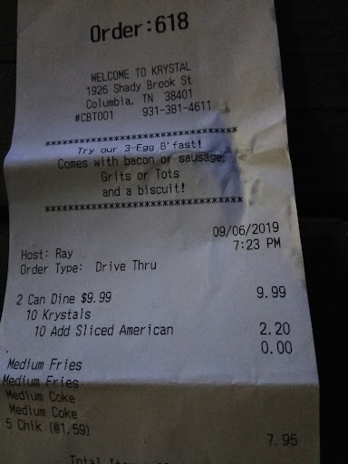 Read moreDrove 20 minutes into Columbia to get Krystal’s, and when we got to the speaker, we were told to “hold on” twice before met with “we’re closed.” the online hours say 12 am, which I told the lady at the speaker and she said “we actually close at 9 but we need an hour to close the store down.” It was 8:38… we asked for her general managers information and she said she was the general manager, then we asked for the district managers information and she finally agreed to take our order. We were in no way going to let her make our food so we declined and asked again for her supervisors information. She refused. We were trappped between the car behind us and the car in front of us, with no way to leave since it’s a closed in drive thru. She threatened to call the cops on us for “cursing.” We were trapped there and she was trying to close the store early because she’s lazy. Pitiful. No one insulted her, but she was informed that it’s unprofessional to just stop taking orders because you don’t feel like working...