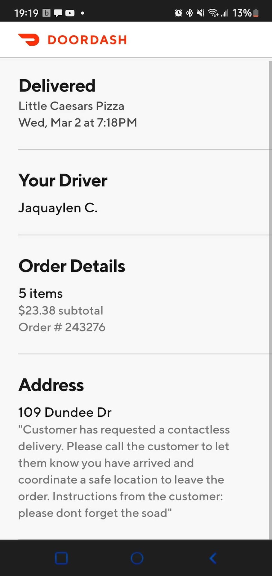 Read moreThis is the 4th time we have ordered in the last few months. Our food is always delivered by door dash. Every single time the driver forgets the drinks. Not a big deal, most times we ignore it and this time the driver offered to go get it. Super nice driver. This time AND the time before, our food was raw. I called the last time we ordered online and the driver refused to get our drinks and the manager said he couldn't do anything because we ordered online unless we wanted to go in. The point of ordering was so we wouldn't have to drive. I pushed hard enough and they said they would mail coupons which never happened. I am not going to waste my time again with calling in and will NEVER go there again. You can clearly see in the picture the cheese was solid and the dough is not cooked AT...
