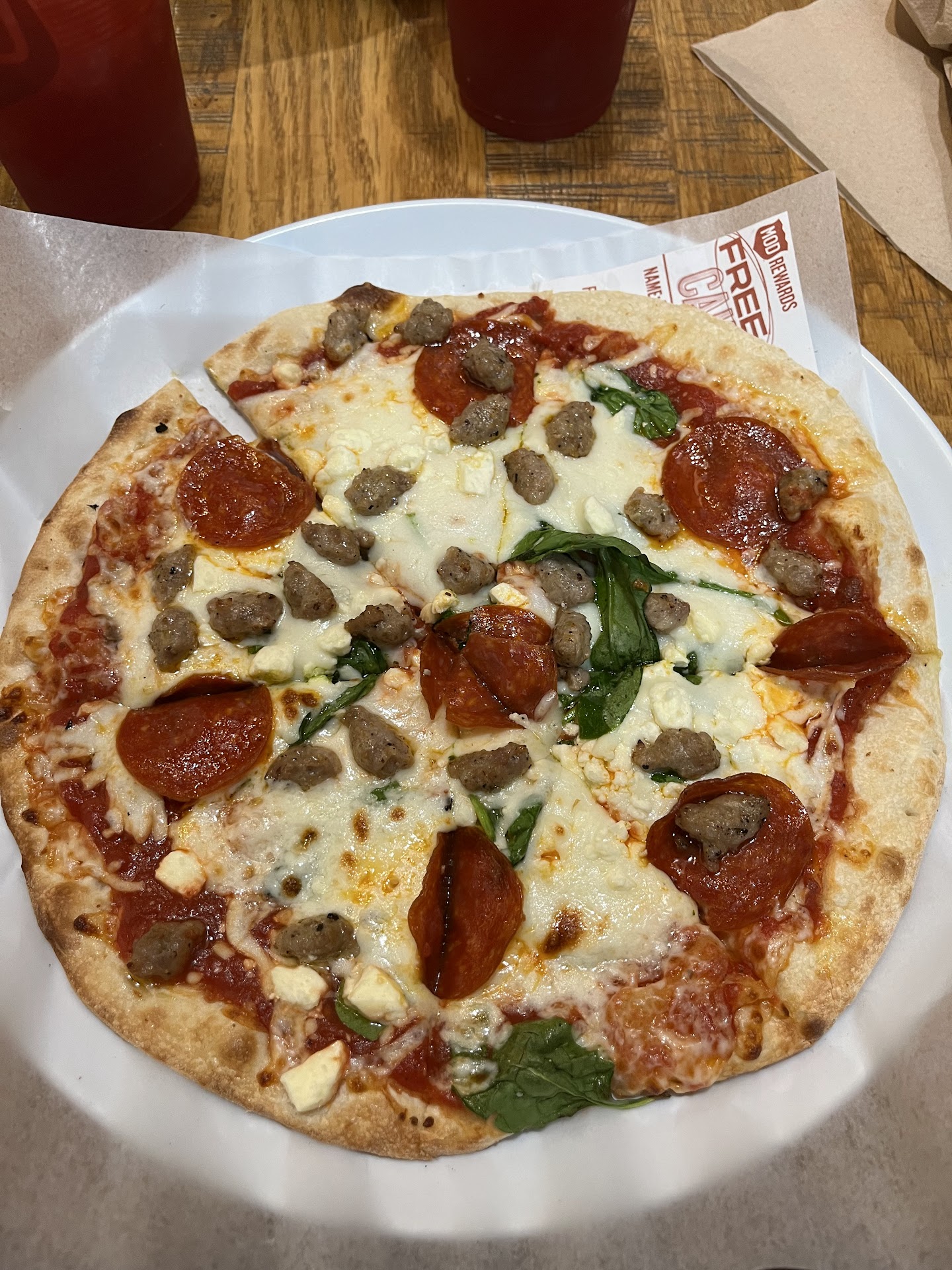 Read moreThis MOD Pizza is located in a shopping area within walking distance to a Barnes and Noble, World Market, and Target. So after shopping at those three stores, we walked over to the MOD Pizza for dinner. We got MOD pizzas, where we could customize our own pizzas. I got tomato sauce as the base, and mozzarella cheese and feta cheese. At first, I felt that they did not put a lot of mozzarella on, so I asked for some extra and they sprinkled on a little more. I got spinach, mild sausage, and pepperoni as well. They put it in the oven and we waited about 3 minutes for it to finish. The pizza was amazing. It tasted just how I wanted it to. We also got drinks and we absolutely love to mix the blackberry lemonade with sweet tea. I will say it was pretty warm in the restaurant, which I guess could be attributed to the pizza oven, but it wasn't too bad for the short time we were there. Workers were super nice, though the last step of the final sauce on the pizza was not asked about when we picked our pizzas up. That’s not a huge...