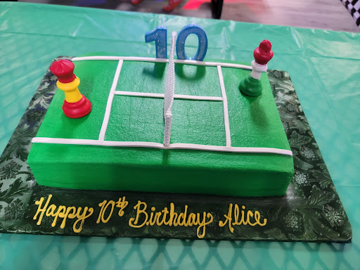 Our daughter was turning 10. We had no idea how to combine her two interests - chess and tennis - in a cake design, so we decided to do a chess-themed cake, but soon realized we couldn't think of a fun and colorful design. So we asked the baker for help. She started by asking our daughter about chess and tennis and more, what she likes, who were her favorite players, etc; they even discussed the recent Roland Garros final. And then she had the cake design: a tennis court with two chess pieces as the players. The chess pieces would have the colors of the Spanish and Italian flags, making it the final between Carlos Alcaraz and Jannik Sinner! And the 1, 0 candles were the score.