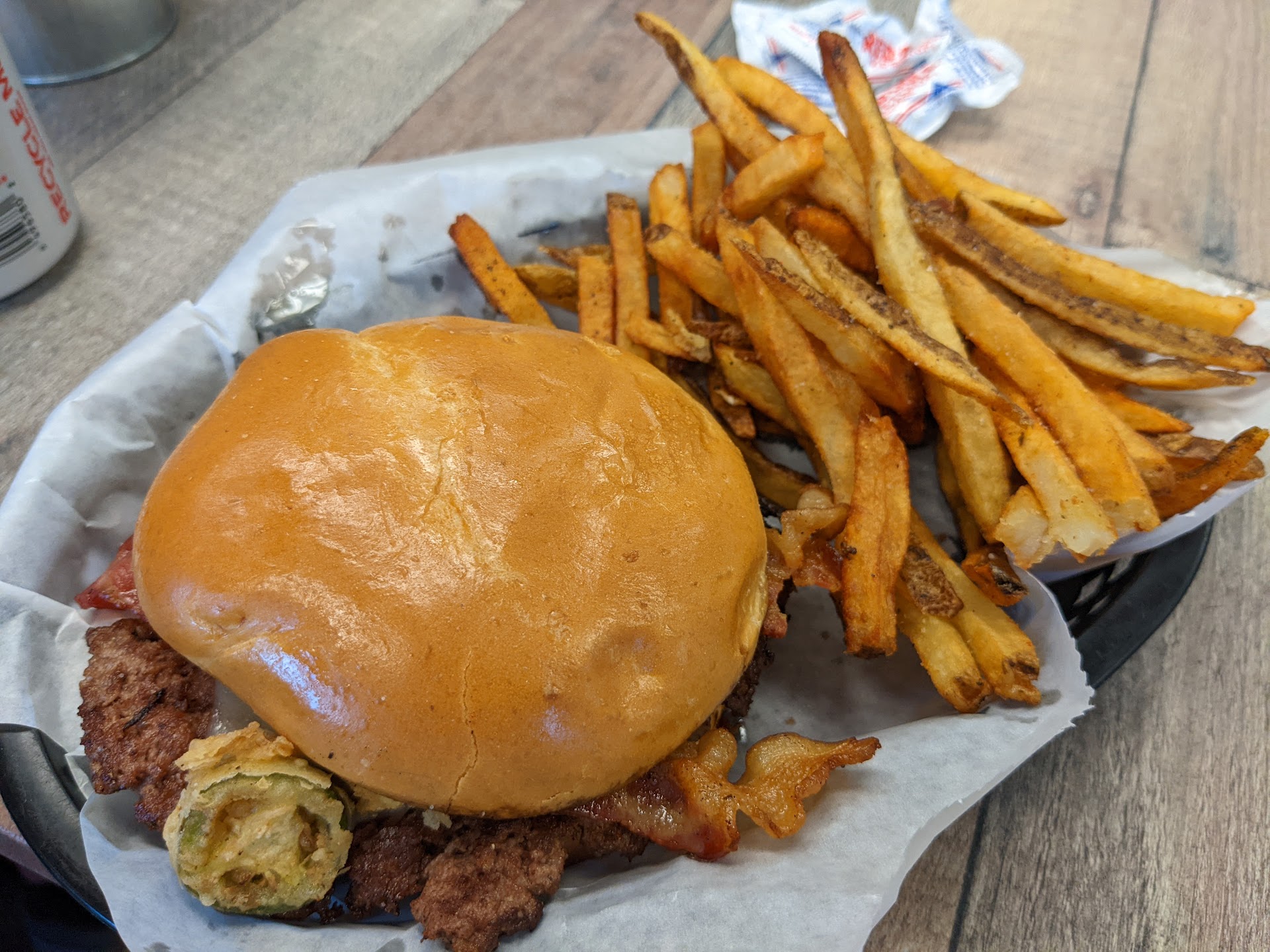The burger was ok, a smash style patty, unseasoned, cooked to order. The bun selection needs to be reevaluated, as the ratio of burger to bun was way off. For the price, you would expect a couple smash patties or a single thicker burger. The patty was very thin, all of the fat cooked off, leaving it dry. It felt like eating a veggie sandwich with a beef patty on it rather than a burger.