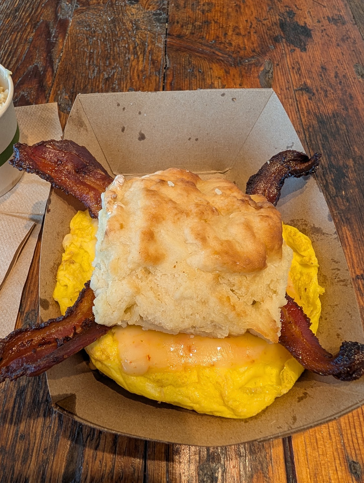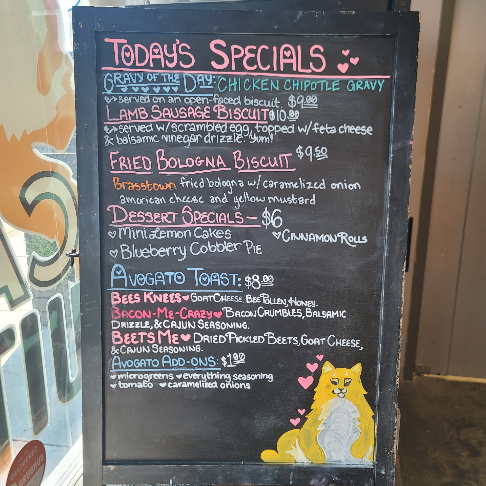 Ā Ā Ā Read moreFirst time visitor. It's a small, quaint spot for breakfast/brunch. There were a bunch of college students ahead of me ordering and the spicy bacon, egg & cheese biscuit seemed to be the most popular order so I decided to try it along with a side of the hashbrown Casserole and a coffee The portion size is ample, for sure. However, after the first bite of the biscuit, I couldn't eat anymore. The ghost pepper cheese ( which I didn't know) that they use was too hot for my taste. But if you like hot and spicy then this may be more to your liking. The biscuit was too thick for the rest of the ingredients, in my opinion. But the egg and bacon were good. The hashbrown casserole was well seasoned and tasty and the coffee was good as well. The service was top notch, the ladies working were very friendly and accommodating. The dining area and tables were clean. I would definitely go back and try some of the other goodies, such as the fried green tomatoes and pimento cheese, as well as one of the...