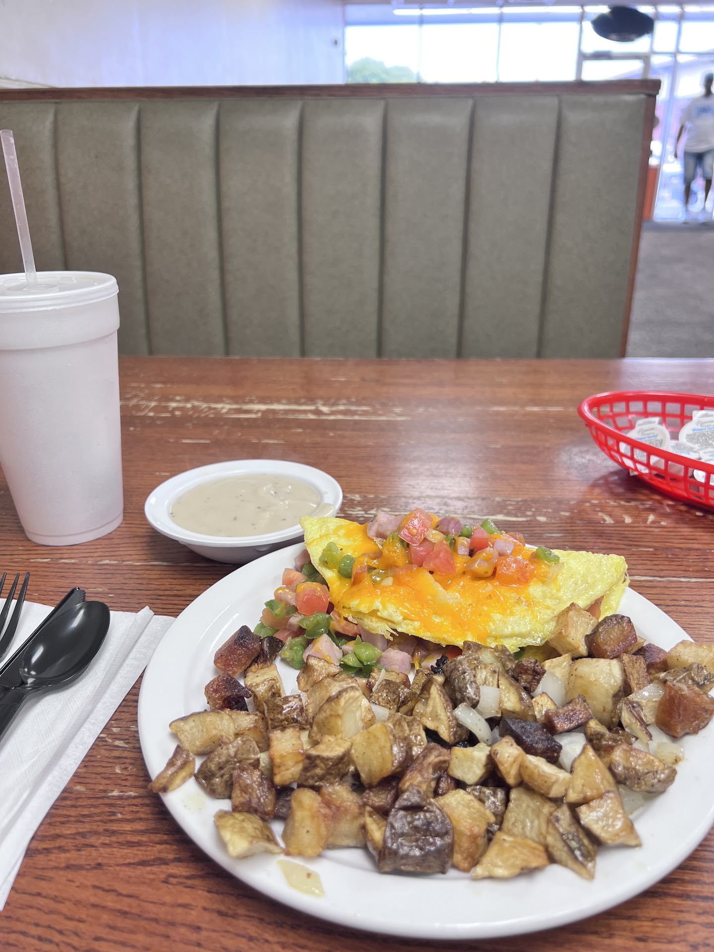 Read moreI had high hopes from the reviews. I ordered gravy side, no bread, hashbrowns and western omelet, with sweet tea. Seat yourself at booths or a little table. Plenty of parking lot parking. Not their finest dining moment. I hate to say this without a photo, but my first instinct when I saw something black and wirey looking sticking out of my hashbrowns was to put it out, look at it and quickly get it off of my fingers. I took an original photo when food came out and can kind of see the issue but I did not notice until I started eating and moving the food. Service was fine. Some people came in for to go’s and some ate inside.