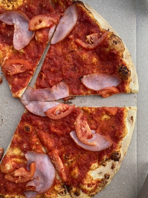 I stood inside for a little bit while one of the employees started on the pizza. On the online ordering, it doesn't say anything about using mozzarella as a base and all other cheeses were essentially additional toppings. One of the pizzas was for someone who doesn't love cheese and mozzarella is normally overbearing. So, she chose parmesan only. While he was making it he looked at me and said no mozzarella? I said no - whatever the order said. Not indicating that the parmesan wouldn't cover the pizza. This specific order was regular crust, parmesan cheese, tomatoes, Canadian bacon, and regular bacon. Y'all...look at this picture. This is what we got! The cheese might has well have been left off entirely, the Canadian bacon was dry as a bone, and they forgot the regular bacon completely. Not sure this could even be called pizza.