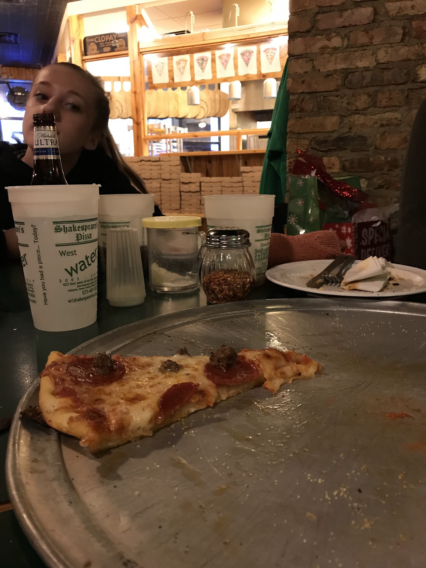 I've been going to Shakespeare's Pizza for twenty years now. It used to be a lot more close to reasonably priced but now the prices are extremely high! I went there the other day with my parents and my kids and we ordered two large pizzas five sodas the total was barely under $100 they were very large pizzas and they were pretty good but I can't say it was even near worth the price. We could have gotten 12 pizzas and several 2L of soda at Little Caesars for that price. Also going to Shakespeare's West just doesn't seem authentic The original downtown Shakespeare's was the real deal and now that they've made other locations it's just a fake atmosphere to me because I grew up with the real deal. Original Shakespeare's used to have great drink specials you could get a pint of Sierra Nevada and a shot of Jameson for $3 plus tax it was a great deal. The service was okay-ish but the employees are absolutely overworked and underpaid. I think they got popular over the years and now I feel like they're just exploiting the popularity of their name to overcharge tons of people because a lot of them go there for the nostalgic value. Overall I would say it's not worth it. But at the same time I'll probably eat there again at some point but I'll definitely feel ripped off that time...