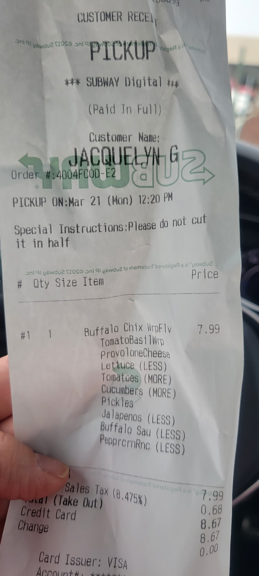 Read moreI ordered two sandwiches today through the mobile app, both identical. It said there were no green peppers, which is okay I just made my sandwich’s without them. Picked them up, drove home, and both sandwiches were wrong. Off the bat, the breads were wrong but I can look past that, maybe they ran out before the app could notify me like the green peppers. Now what confuses me is the lack of ingredients in the sandwiches, and both having different sauces. One had mayo and the other had honey mustard, when they were supposed to have mayo and chipotle on each. Just very...