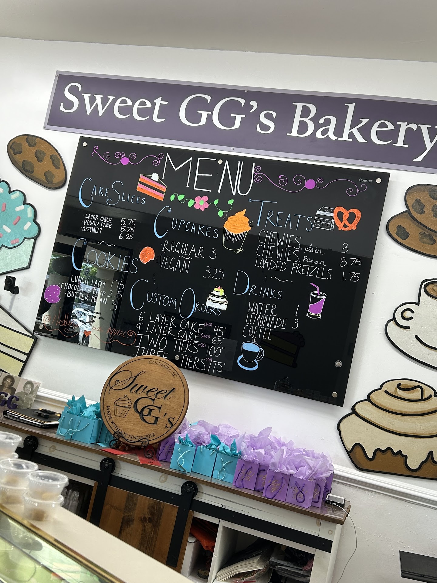 Iâm out of state. After looking at many bakeries in the Columbia SC area and reading peopleâs reviews I chose Sweet GGâs bakery. For my daughter's 18th birthday while sheâs attending USC in Columbia. I contacted the bakery through their website and I received a response from Nayo right away. Nayo responded to all my emails right away and was very professional, helpful and kind. She made a beautiful cake for my daughter's big day and she was very happy. The decorations we had chosen were beautifully done, there was edible glitter all over the cake and the way the color came out tied it all together. We ordered a chocolate cake with vanilla frosting, the cake was super moist even after sitting for a couple of hours in the fridge. The frosting also wasnât too sweet and overpowering. It was overall, super delicious and I would definitely contact Nayo again and order another cake from Sweet...