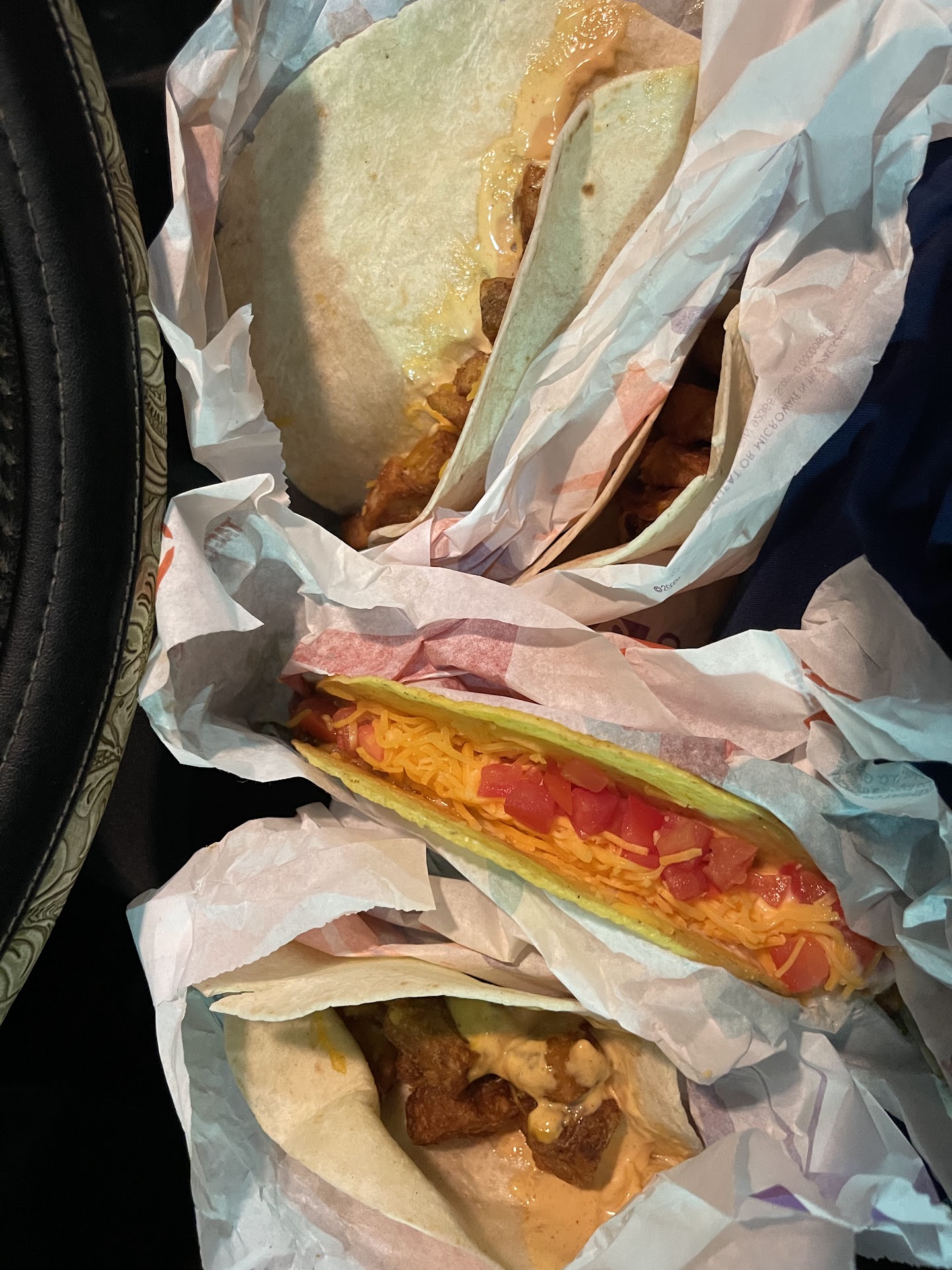 Don't go here. The service was not good. It felt like an inconvenience to place an order. We pulled up and never said a word and after a good 15 seconds we got a "one moment" in a very frustrated tone. OK, no big deal, maybe they're slammed. They were not. There was no one else in the drive through and two cars in the lot. Then we got our food. I ordered two soft tacos and a bean burrito. I asked for extra red sauce on the burrito and received an audible drawn out sigh from the woman taking our order on drive through. On the way back to the hotel I ate the first taco. It was literally so undersized the preparer made it into a burrito roll. There is not that much more tortilla on a taco to do that, much less do it to the point it perfectly held its form and did not leak in the two small bites it took me to consume it. Taco number two: ditto. So we get in the room and I comment my burrito will be the same, as it was, more sauce than anything. As I chuckled, my wife opened her Mexican pizza; a barely recognizable facsimile of what a Taco bell pizza would be if you ordered it off Temu. Barely any sauce, tomatoes thrown at it like the person that made it thinks he's batman and the tomatoes are the joker and the fried tortilla is a brick wall, all the skimpy cheese a good inch and a half from the edge and flat as a pancake. Of course, this after we went to the KFC in this same town last night and were informed an hour before closing they had one PIECE of chicken to sell. A leg. At A KFC.... IN KENTUCKY. hmm same Corp, maybe same franchisee? I dunno. Either way, cross this Taco Bell off the list. Run for the border... maybe...