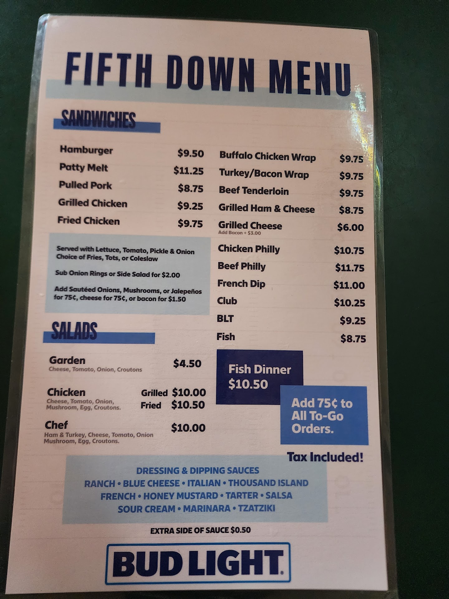 Read moreChicken strips and tater tots were nice and hot, right out of the kitchen (server "warned" me). Typical taste--like you'd make out of the freezer at home. No special seasoning, but tasty. Ranch dip was a little thin. Only water to drink; needed to get up for refill (waited a couple of minutes). Also needed to get up for the ticket. Server came back once, a few minutes after serving food, but didn't follow up on drinks or anything else. Atmosphere was fine (went for football game), temperature was good. Plenty of parking. Tv above the bar is faded (from afternoon sun,...