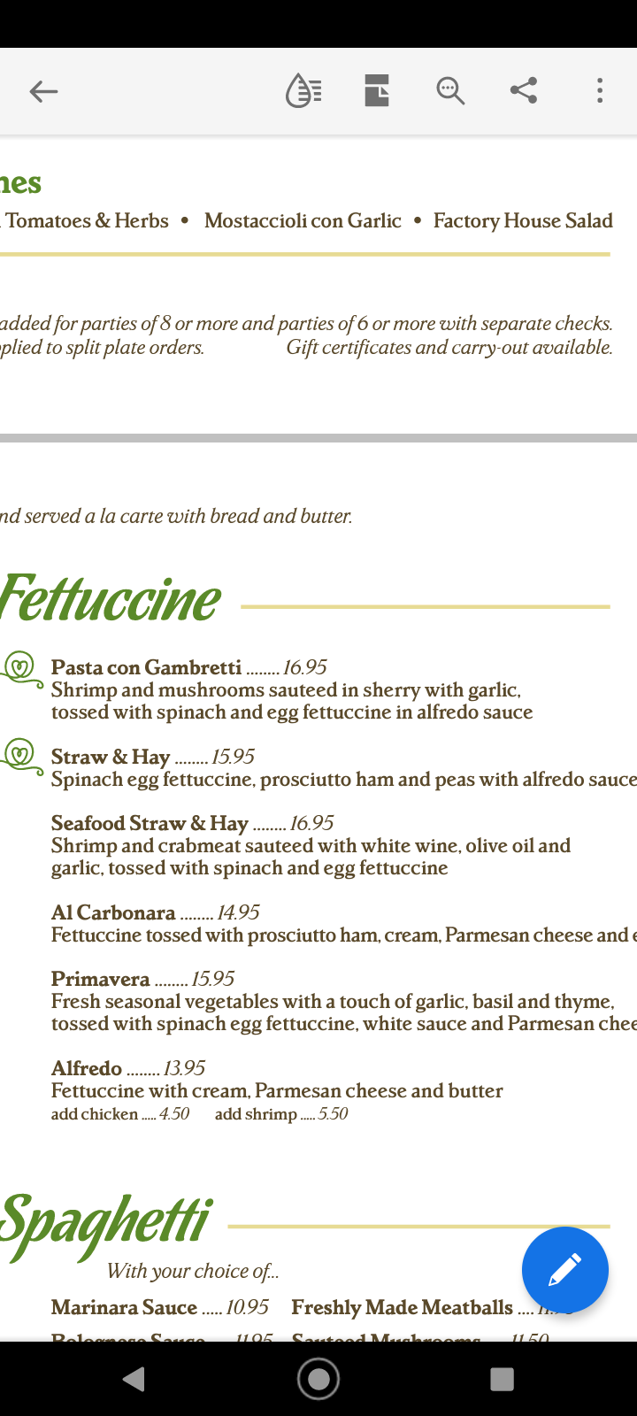 Read moreI haven't eaten at the Pasta Factory in years so was delighted when friends suggested we meet there for dinner. I don't consider myself a food critic nor am I hard to please when it comes to dining out. I have eaten in some of the best food at hole-in-the-wall venues around the country. Needless to say, I was very disappointed in what was once a fine dining experience. It is sad seeing a somewhat upscale niche restaurant go from a lovely historic building in downtown to something lesser in their strip mall location. While they tried to make the atmosphere similar, it was just a fail in my opinion.